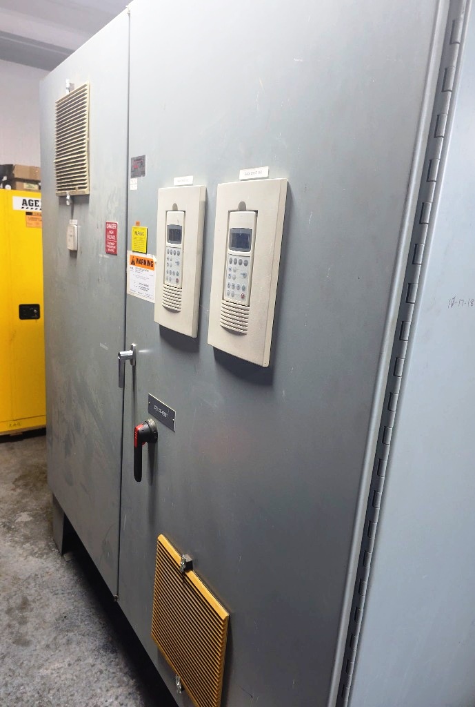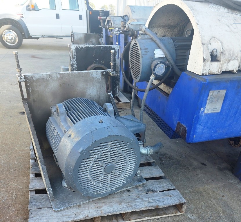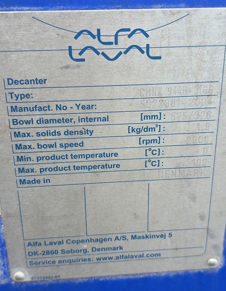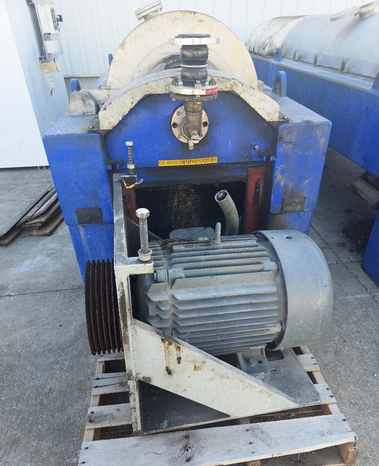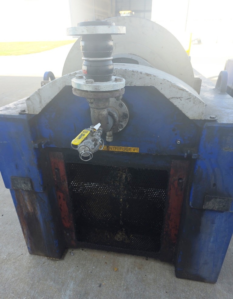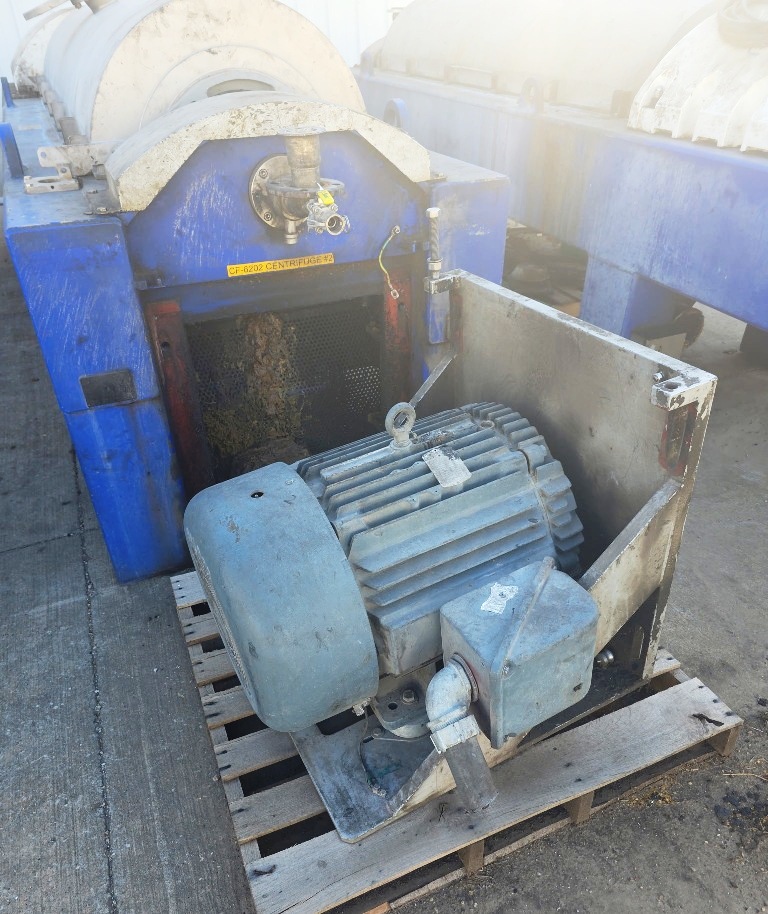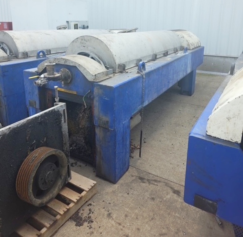 Max bowl speed 2900 RPM, 2703 x G, 574 x 2438mm (22.6 x 96") bowl ID. 8 degree contour beach, STC-tiled feed zone and cake ports, 190mm single lead STC-tiled conveyor, 100 HP motor 460/3/60/1780 RPM, 102:1 12 kNm DD gearbox, 30 HP backdrive, NEMA 4X wall panel with touch screen, NEMA 12 vented CPU panel, feed tube, guards, vibration switch/isolators and chutes. Prior use: Spent grain dewatering. 2004 vintage. Very good condition.