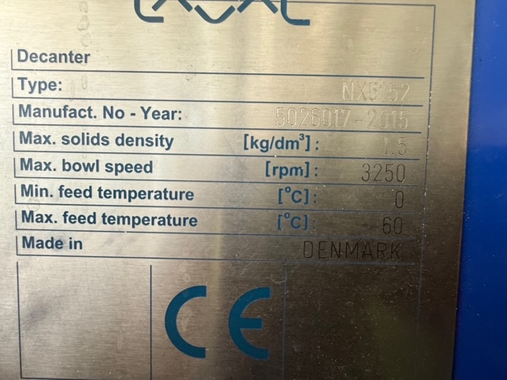 Max bowl speed 3250 RPM, 3011 x G, 510 x 2244mm = 20 x 88.3" bowl ID, CIP casing flush nozzles, 10 degree contour bowl, 360 degree cake ports with wear protection, 6" single lead STC-tiled conveyor, 101:1 DD 12 Knm gearbox, 40 HP motor 460/3/60/1760 RPM, 30 HP backdrive, guards, feed tube and chutes. Control panels with ABB controller and Danfoss VFDs. 2015 vintage. Excellent condition. Used only 6 months after major rebuild. Includes 2 major rebuild kits. Same size as ALDEC G2-95 and Y9.