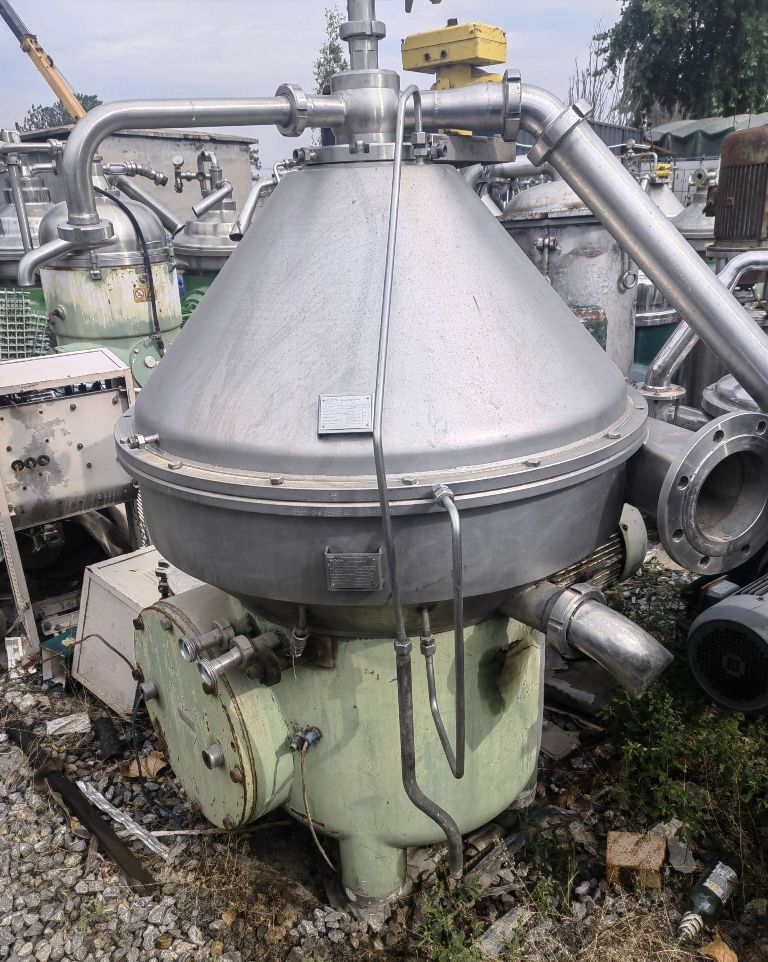 (2) Westfalia RSE 110-01-776 vegetable oil separators, 316SS. are engineered for high-efficiency separation of vegetable oils, making them an ideal choice for industries that require reliable and effective processing solutions. With a maximum bowl speed of 5260 RPM and a centrifugal force of 8950 x G, these separators are capable of handling large volumes of liquid with a rated capacity of 30,000 liters per hour (LPH). The design ensures that both liquid phases are discharged under pressure, optimizing the separation process and minimizing downtime. The robust 30 KW motor operates at 380V, 3-phase, 50 Hz, with a speed of 1460 RPM, ensuring consistent performance even in demanding operational environments. These separators are vintage models from 2000 and 2001, yet they remain in very good condition, demonstrating the durability and longevity of Westfalia's engineering excellence.