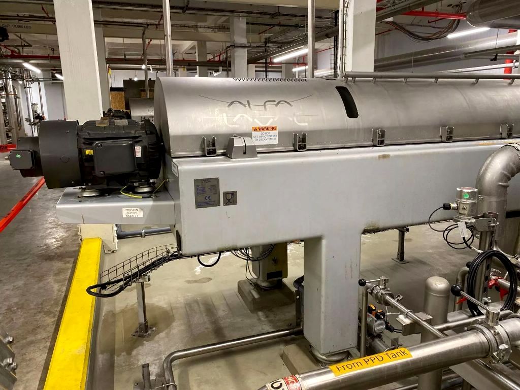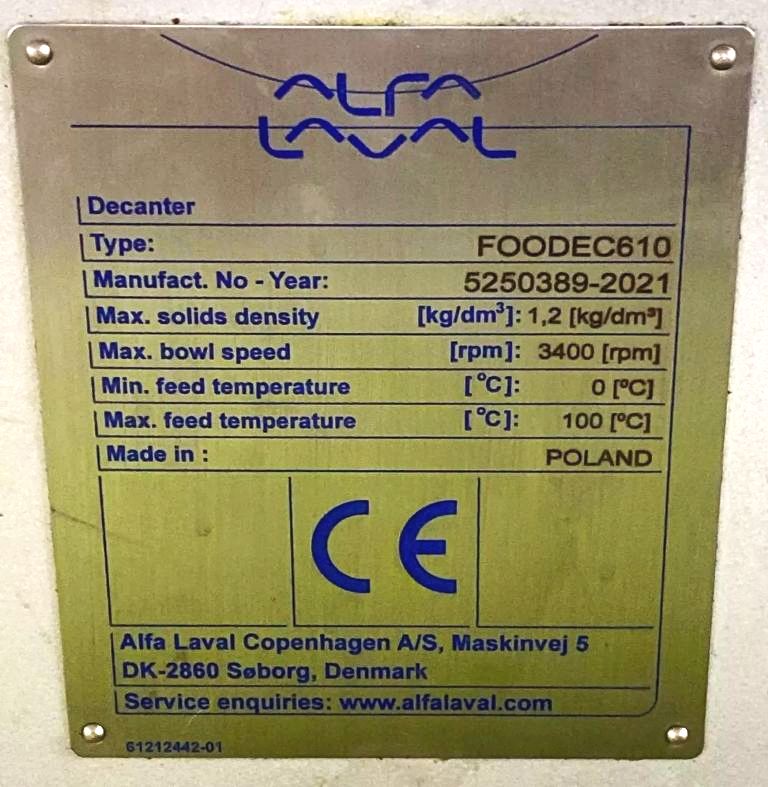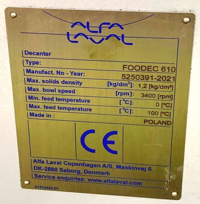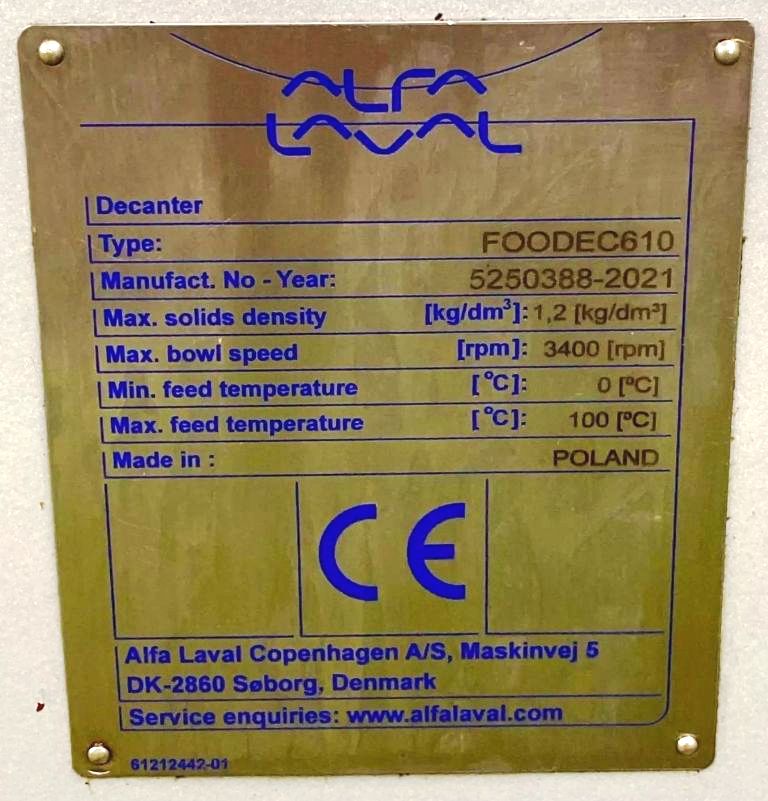 The (3) Alfa-Laval FOODEC 610 sanitary decanter centrifuges, 316SS. represent a pinnacle of engineering designed for high-efficiency separation in various industrial applications, particularly in the food and beverage sector. With a maximum bowl speed of 3075 RPM and a centrifugal force of 3040 x G, these centrifuges are optimized for rapid and effective separation of solids from liquids. The 10-degree beach angle enhances the separation process, ensuring that the solids are efficiently discharged at a 360-degree angle. This design allows for a continuous operation, making it ideal for high-volume processing environments such as breweries, where consistent quality and throughput are paramount. The liquid discharge is facilitated under pressure through a paring disc and skimmer tube, ensuring that the liquid phase is removed effectively while minimizing the risk of contamination, which is critical in sanitary applications.