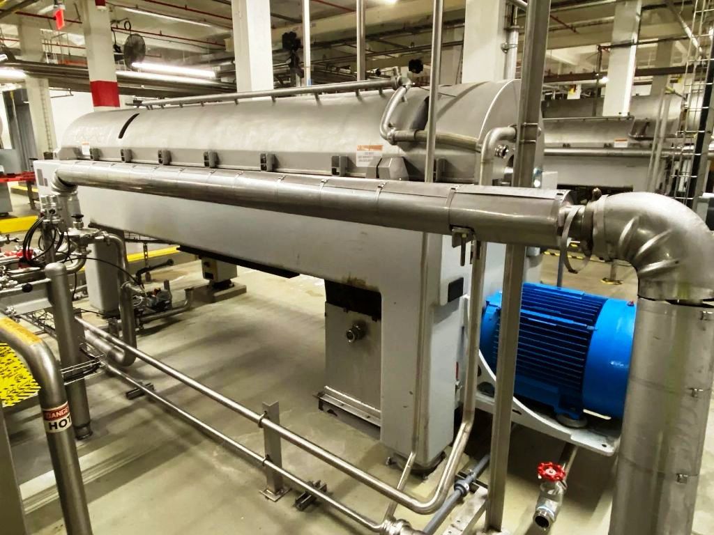 Constructed from high-grade 316 stainless steel, these centrifuges are not only robust but also resistant to corrosion, making them suitable for handling various liquids, including those with high acidity or other challenging properties. The 7.5-inch single lead hardsurfaced conveyor and the powerful 75 HP motor (460/3/60/1780 RPM) work in tandem to ensure that the solids are efficiently conveyed out of the bowl, while the 30 HP backdrive provides additional support during operation. The inclusion of guards, a CIP (Clean-In-Place) bar, and vibration switch/isolators enhances the safety and maintenance of the equipment. With a compact footprint of 575 x 2565mm (22.6 x 101 inches) and mounted on a 4-foot stand, these centrifuges are designed for easy integration into existing production lines, making them an excellent choice for facilities looking to upgrade their processing capabilities.