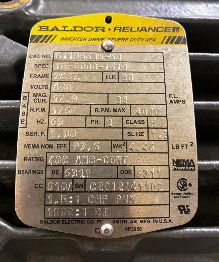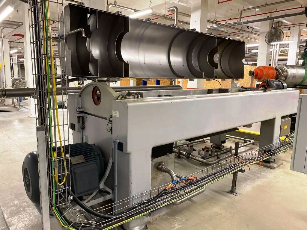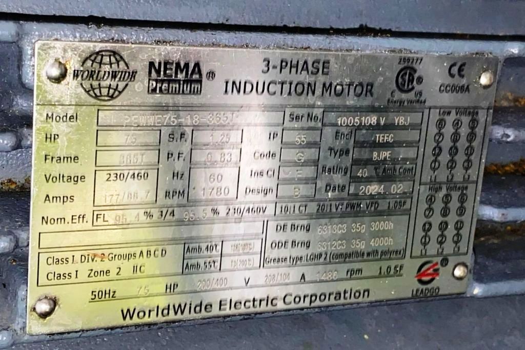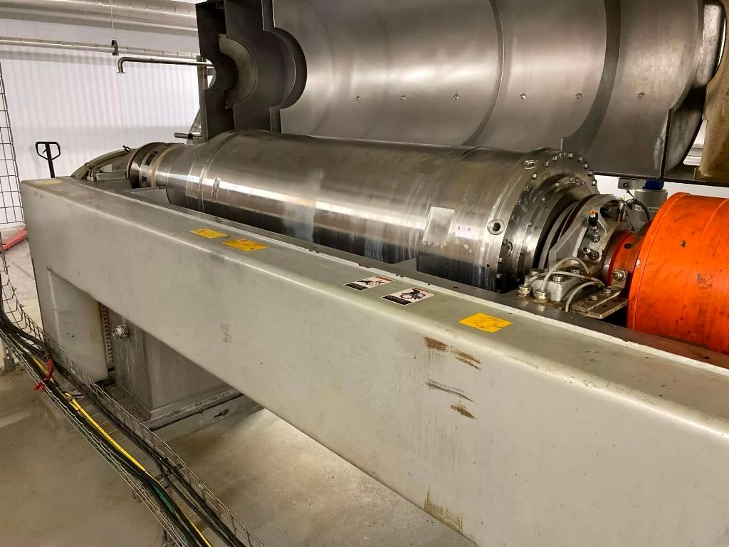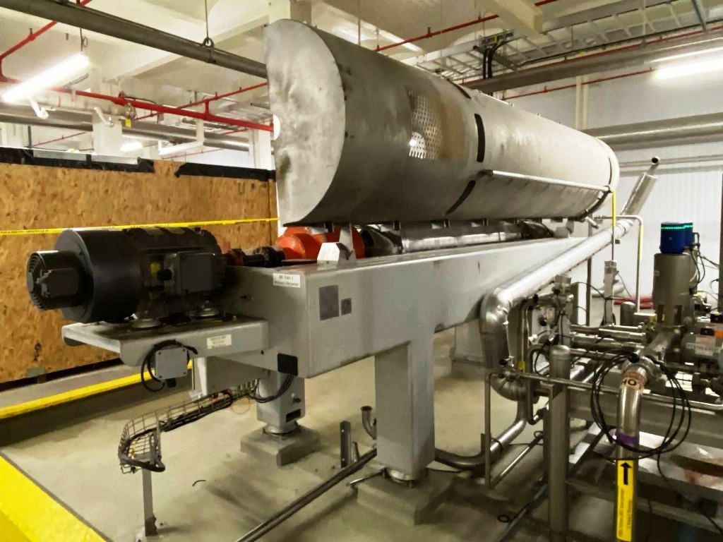 Max bowl speed 3075 RPM, 3040 x G, 575 x 2565mm (22.6 x 101") bowl ID. 10 degree beach angle, 360 degree cake discharge, liquid discharged under pressure via paring disc thru skimmer tube, 7.5" single lead hardsurfaced conveyor, 75 HP motor 460/3/60/1780 RPM, 102:1 12 kNm DD gearbox, 30 HP backdrive, guards, CIP bar, feed tube, vibration switch/isolators and chutes, mounted on 4' stand. 2021 vintage. Prior use: Brewery. Excellent condition.