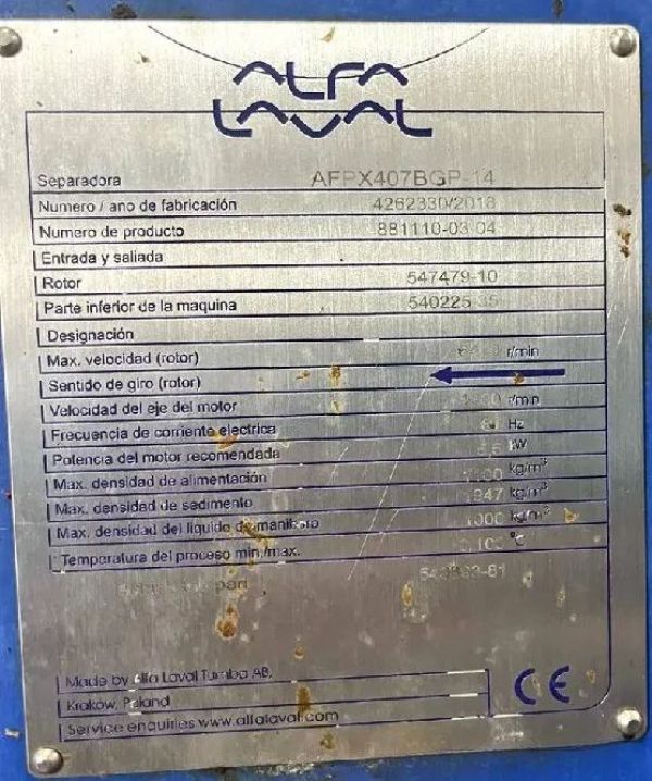 Max bowl speed 6400 RPM, 7000 x G, 4.4 L sludge capacity, both liquid phase discharge by gravity. 7.5 HP motor 460/3/60/1750 RPM. 2018 vintage. Excellent condition. Located in Mexico.
