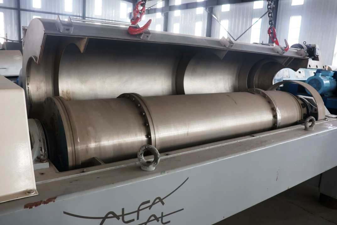 The Alfa-Laval ALDEC G2-70 features a robust construction, including a 360-degree cake port system with wear protection, which significantly extends the lifespan of the equipment and reduces maintenance costs. The 6-inch single lead STC-tiled conveyor is designed to efficiently transport the separated solids, while the 169:1 gearbox and 6.0 kNm torque rating provide the necessary power for consistent operation. The 37 KW motor, compatible with multiple voltage configurations (380/690/3/50/1480 RPM), ensures that the centrifuge operates smoothly under varying electrical conditions. Additionally, the 15 KW backdrive system enhances operational reliability by allowing for reverse operation when necessary. This equipment, manufactured in 2016 and in excellent condition, is currently located in Africa and is comparable to models such as the ALDEC 508, AVNX 4565, and NX 937, making it a versatile choice for industries seeking a high-performance decanter centrifuge.