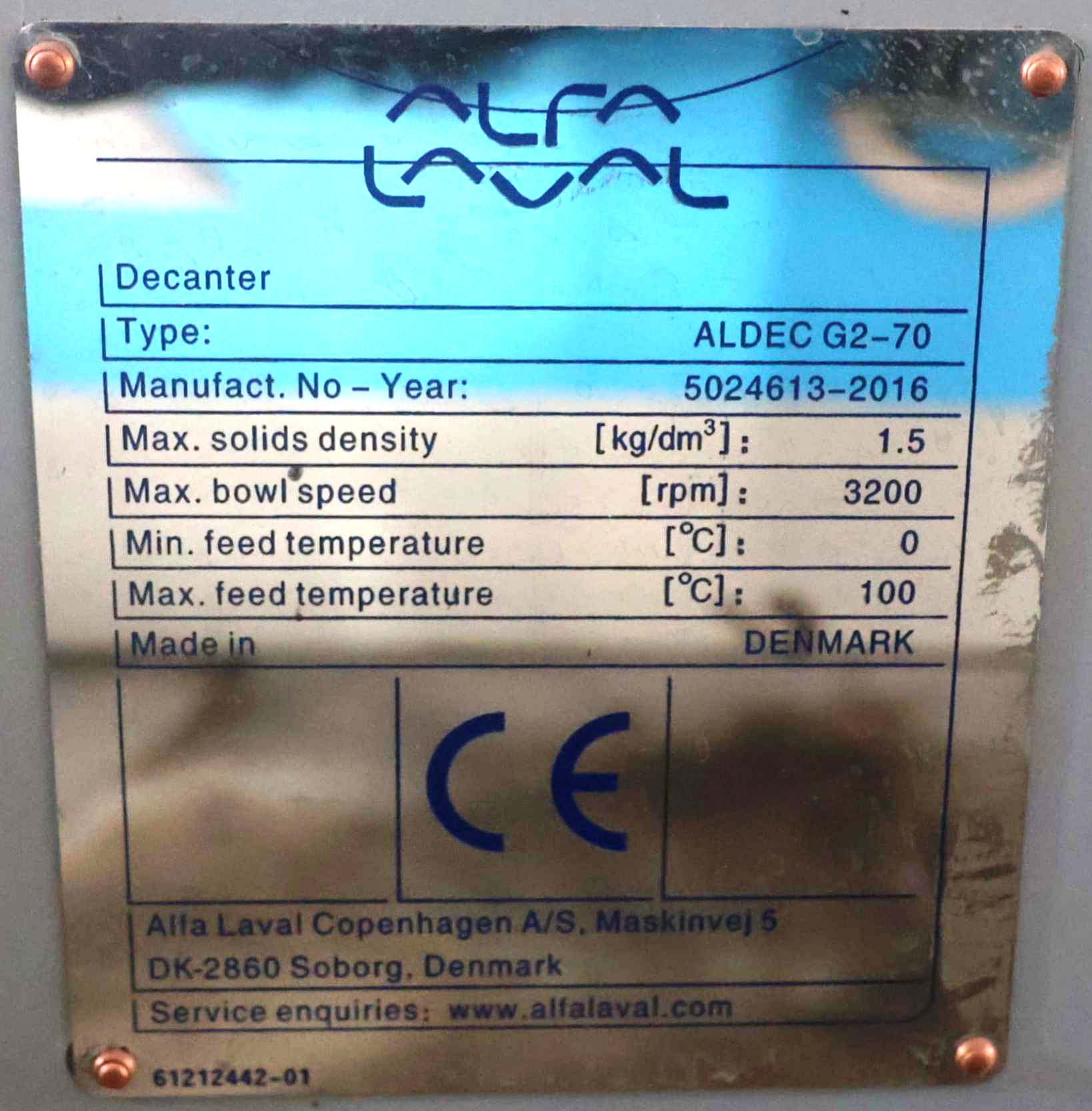 The Alfa-Laval ALDEC G2-70 Smart decanter centrifuge, Duplex SS. is engineered for high-efficiency separation processes, making it an ideal choice for various industrial applications, including food processing, wastewater treatment, and chemical industries. With a maximum bowl speed of 3200 RPM and a centrifugal force of 2574 x G, this decanter centrifuge is designed to handle large volumes of liquid while ensuring optimal separation of solids and liquids. The 20-degree contour bowl design enhances the separation process by allowing for a more effective settling of solids, which is crucial in achieving high-quality output. The unit's rated capacity of 120 GPM ensures that it can meet the demands of high-throughput operations, making it a reliable asset for any facility looking to improve its separation efficiency.
