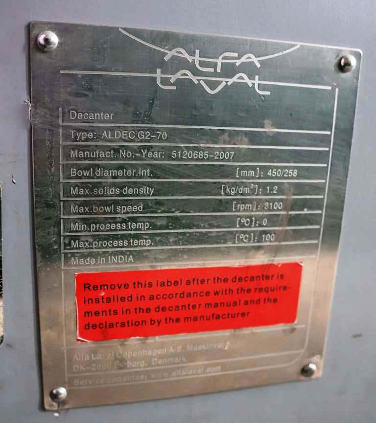 The robust construction of the Alfa-Laval ALDEC G2-70 is complemented by its advanced features, including a 6-inch single lead STC-tiled conveyor and a powerful 37 KW motor that operates at 380/3/50/1450 RPM. The gearbox, with a 169:1 ratio and a torque capacity of 6.0 kNm, ensures that the centrifuge operates smoothly and efficiently under varying load conditions. Additionally, the 15 KW backdrive system provides enhanced control during the separation process, allowing for adjustments based on the specific characteristics of the feed material. With its comprehensive lube system and well-designed feed tube, this centrifuge is not only efficient but also user-friendly, making it easier for operators to maintain optimal performance over time. This unit, manufactured in 2007 and in excellent condition, is strategically located in Africa, ready to enhance your processing capabilities.