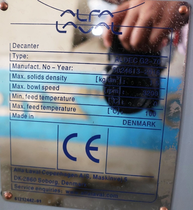The Alfa-Laval ALDEC G2-70 features a robust construction with a 316 stainless steel body, ensuring durability and resistance to corrosion, which is vital for maintaining performance in harsh environments. The design incorporates 360-degree cake ports equipped with wear protection, which minimizes maintenance needs and extends the lifespan of the machine. The single lead STC conveyor, with a ratio of 169:1, is driven by a powerful 6.0 kNm gearbox and a 37 KW motor operating at 380/3/50/1450 RPM, providing reliable and efficient operation. Additionally, the 15 KW backdrive system ensures that the centrifuge can handle varying feed conditions effectively. This unit, manufactured in 2016 and in excellent condition, is currently located in Africa, making it a valuable opportunity for businesses looking to enhance their separation capabilities with a high-quality, pre-owned centrifuge.