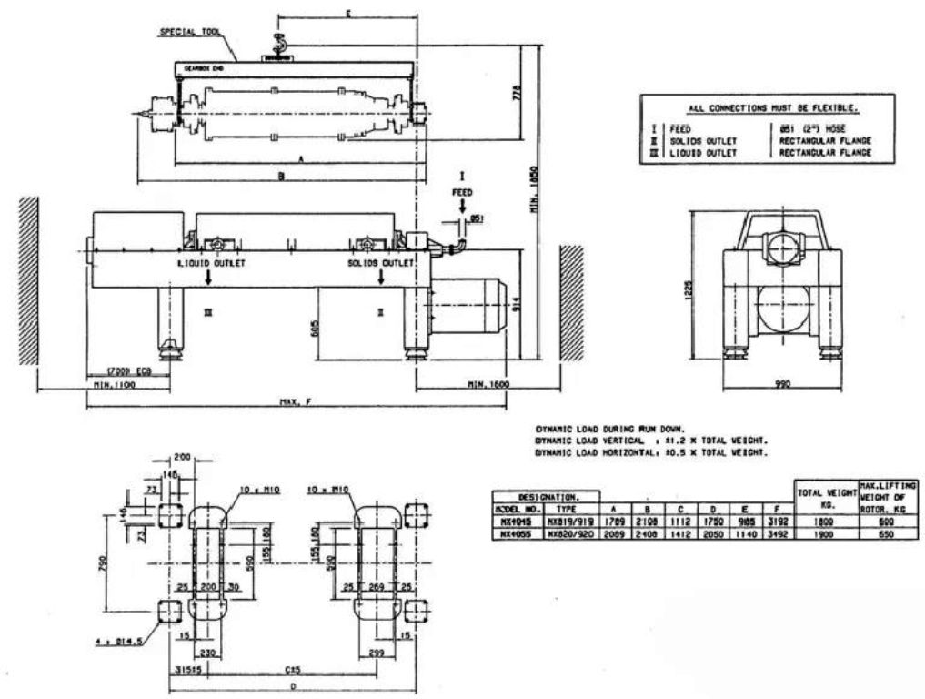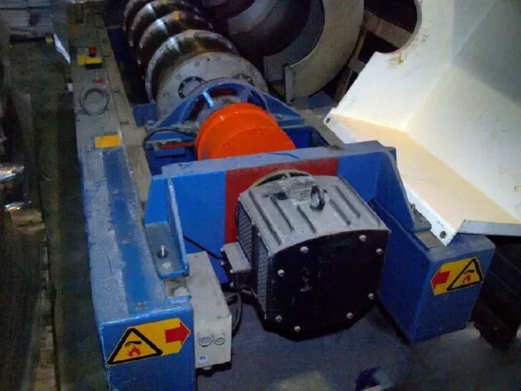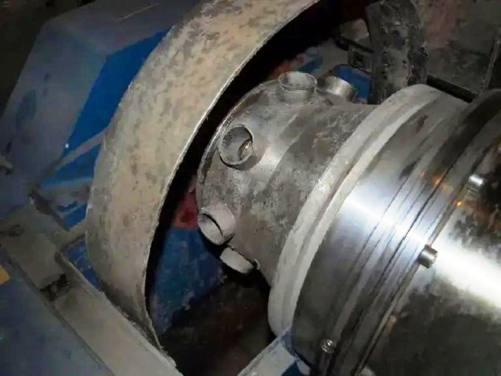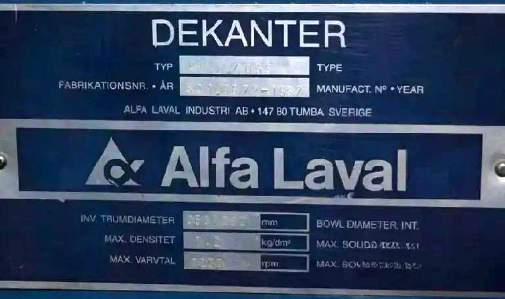 Max bowl speed 3250 RPM, 2100 x G, 20 degree beach angle, 70mm single lead STC-tiled conveyor, 159:1 gearbox, 22.5 KW motor 380/3/50, 5.5 KW backdrive, guards, feed tube, vibration switch/isolators, control panel and chutes on stand. Prior use: Wastewater. 1987 vintage. Very good condition. Located in Europe.