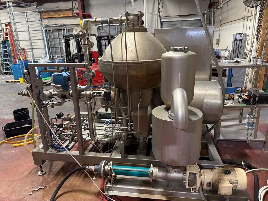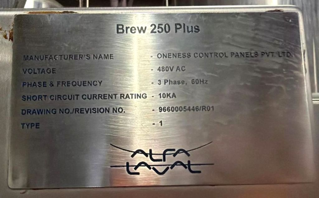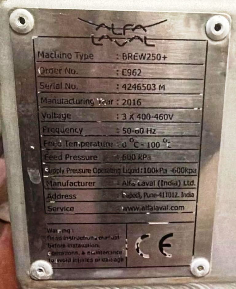 The Alfa-Laval BREW 250+ hermetic clarifier centrifuge module, 316SS, is engineered for high-efficiency separation processes, particularly in the brewing and beverage industries. With a maximum bowl speed of 6250 RPM, this centrifuge is capable of processing up to 250 hectoliters per hour (91 gallons per minute), making it an ideal solution for large-scale operations that demand both speed and precision. The unit features a Netzsch solids discharge pump that ensures effective removal of solids while maintaining optimal liquid clarity. The integrated sludge cyclone further enhances the separation process, allowing for the efficient handling of various feed materials while minimizing downtime and maintenance needs. The 18.5 KW motor operates at 460 volts, 3-phase, and 60 Hz, providing robust power and reliability, complemented by a variable frequency drive (VFD) that allows for precise control over the centrifuge's operational parameters.