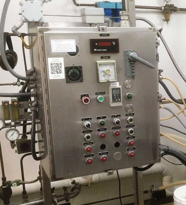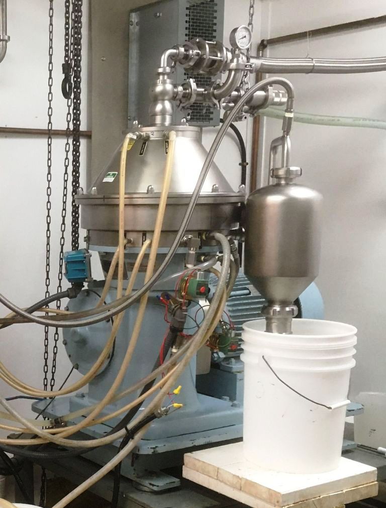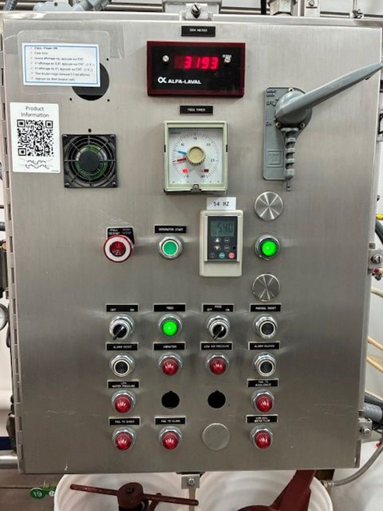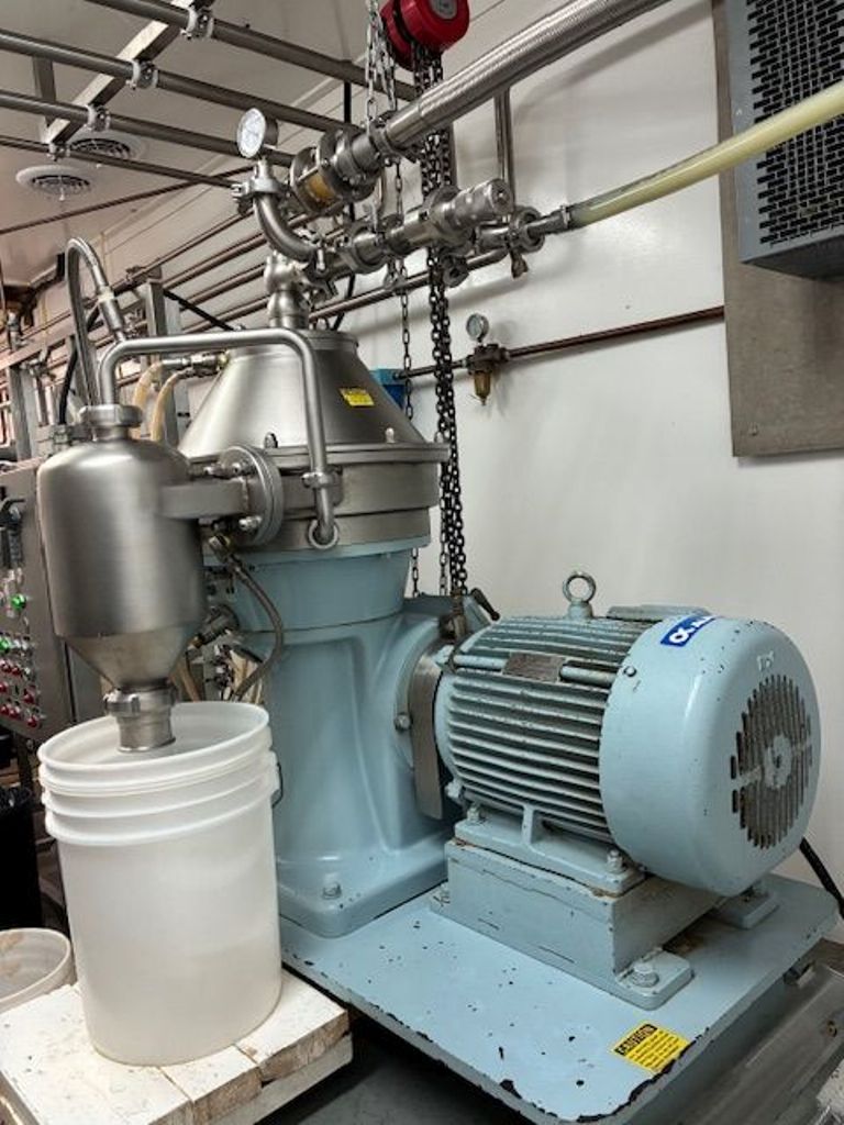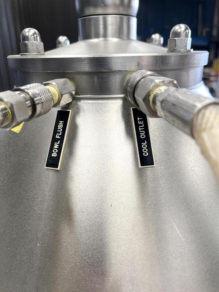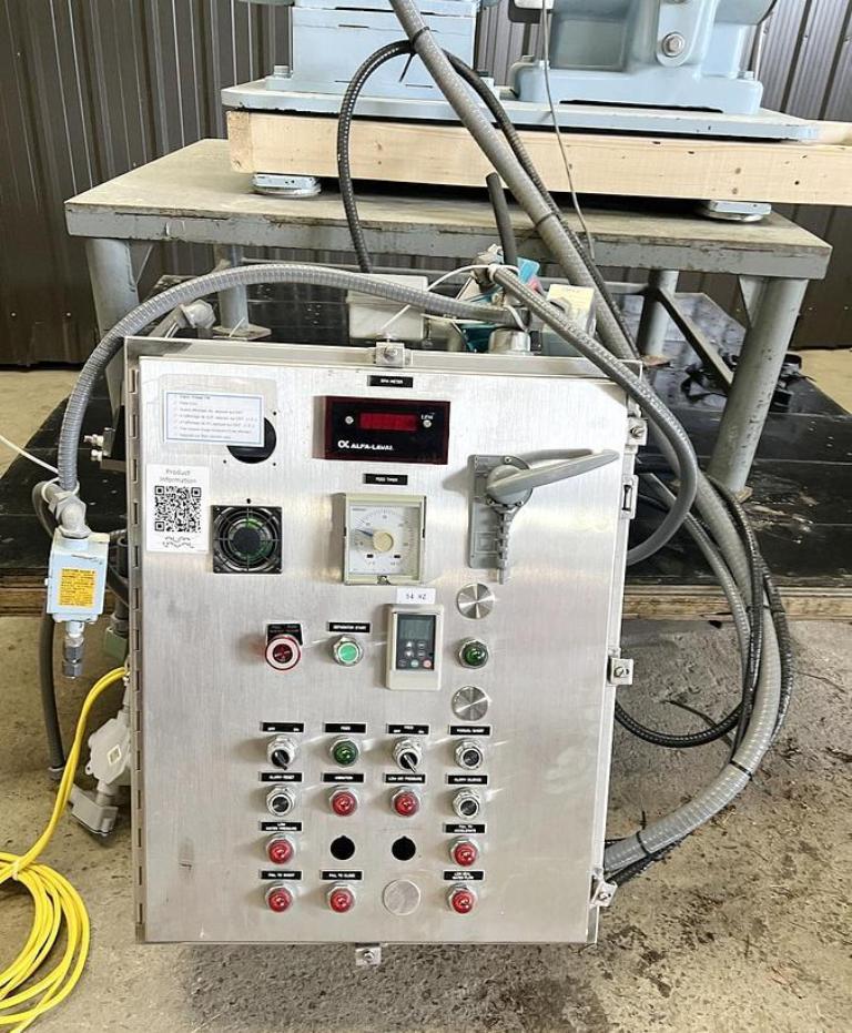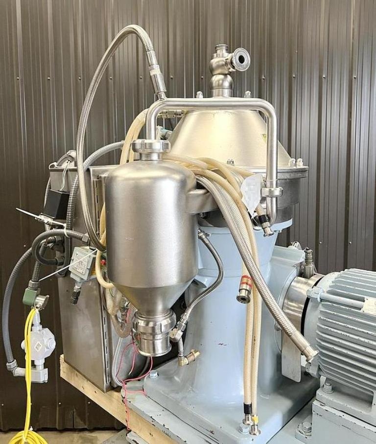 Max bowl speed 9650 RPM, 12,800 x G, steam sterilizable, gastight, liquid phase discharged under pressure, 7.5 HP XP motor 230/460/3/60/3490 RPM, sludge cyclone, piping, water harness and PLC control panel on a skid with tools and manuals. Very good condition. Located in Canada.
