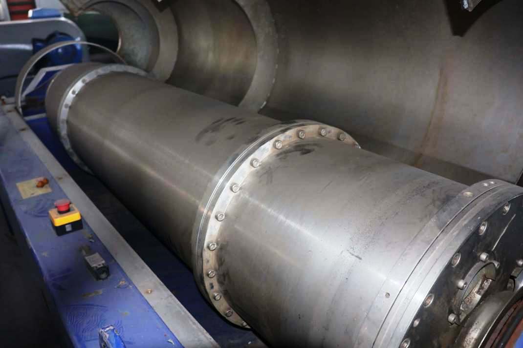 The Alfa-Laval DFNX 4565 decanter centrifuge, 316SS, is engineered for high-efficiency separation processes, making it an ideal choice for various industrial applications. With a maximum bowl speed of 2900 RPM and an impressive centrifugal force of 2115 x G, this decanter is capable of handling substantial volumes, rated at 120 GPM. The bowl dimensions of 450 x 2360 mm (17.7 x 92.9 inches) provide ample capacity for effective separation, while the 20-degree contour bowl design optimizes the sedimentation process, ensuring maximum yield and clarity of the separated phases. The inclusion of 360-degree cake ports with wear protection enhances the longevity of the equipment, allowing for consistent performance even under demanding operational conditions.