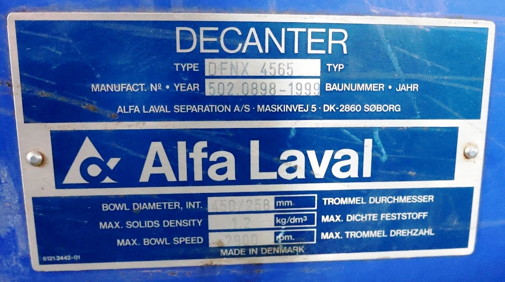The robust construction of the Alfa-Laval DFNX 4565 is complemented by a powerful 55 KW motor, which operates efficiently across multiple voltage configurations (380/690/3/50/1480 RPM). This versatility makes it suitable for a wide range of installations. The decanter is equipped with a 169:1 gearbox and a 15 KW backdrive, ensuring smooth operation and reliable torque transmission. Safety and ease of maintenance are prioritized with the inclusion of guards, a feed tube, and a lubrication system mounted on the stand. This thoughtful design not only enhances operator safety but also simplifies routine maintenance tasks, reducing downtime and increasing productivity. With its 1999 vintage, the Alfa-Laval DFNX 4565 remains a competitive option in the market, comparable to models such as ALDEC 508, SG2-400, and NX 937.