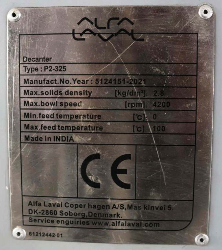 The Alfa-Laval P2-325 sanitary decanter centrifuge, 316SS. is engineered for high-performance separation processes in various industrial applications, particularly in the food and beverage, pharmaceutical, and chemical industries. With a maximum bowl speed of 4200 RPM and a centrifugal force of 3482x G, this decanter centrifuge excels in efficiently separating solids from liquids, ensuring optimal product quality and yield. The bowl dimensions of 353 x 1460mm (13.9 x 57.5") provide ample capacity for handling substantial volumes, while the 10-degree beach angle facilitates effective solid discharge. The 360-degree cake discharge system enhances operational efficiency, allowing for continuous processing without the need for manual intervention, thus minimizing downtime and maximizing productivity.