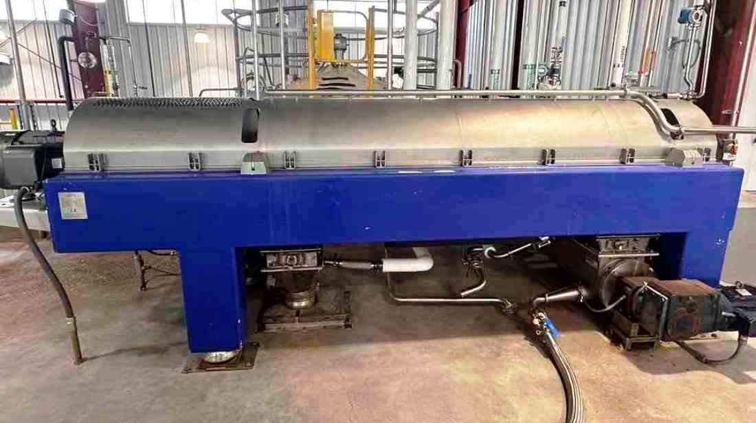 Max bowl speed 2900 RPM, 2703 x G, 574 x 2438mm (22.6 x 96") bowl ID. 10 degree contour bowl. STC-tiled feed zone and cake ports, 190mm single lead STC-tiled conveyor, new 150 HP motor 460/3/60/1775 RPM, 172:1 12kNm Sumitomo gearbox, new 30 HP backdrive, grease lubricated main bearings, feed tube and guards. On stand with chutes. Reconditioned to "as new" and test run. No warranty. Control panel with VFDs available at additional cost.