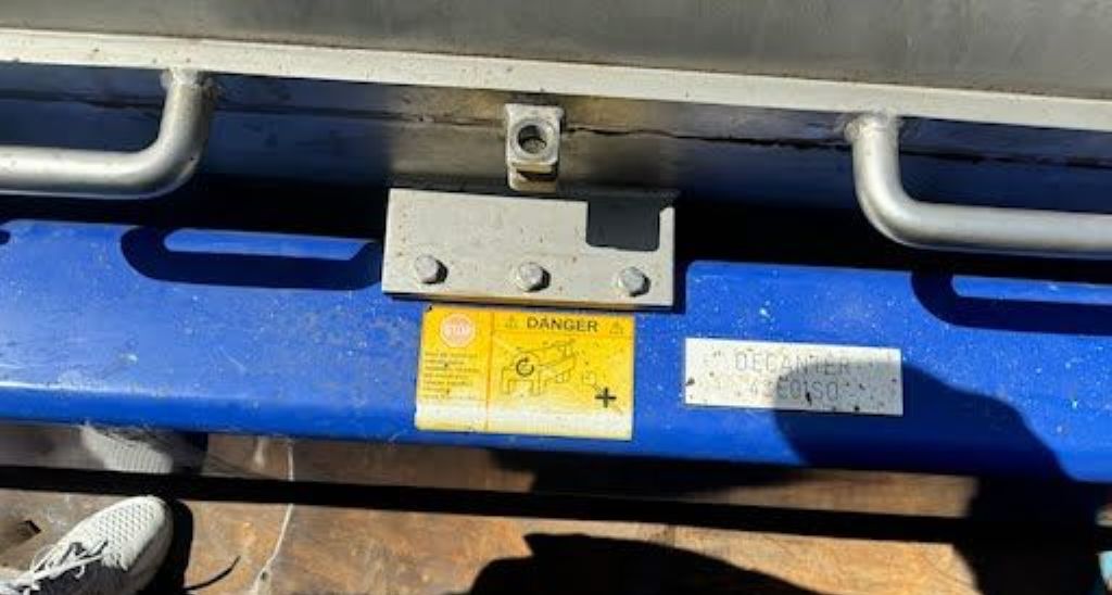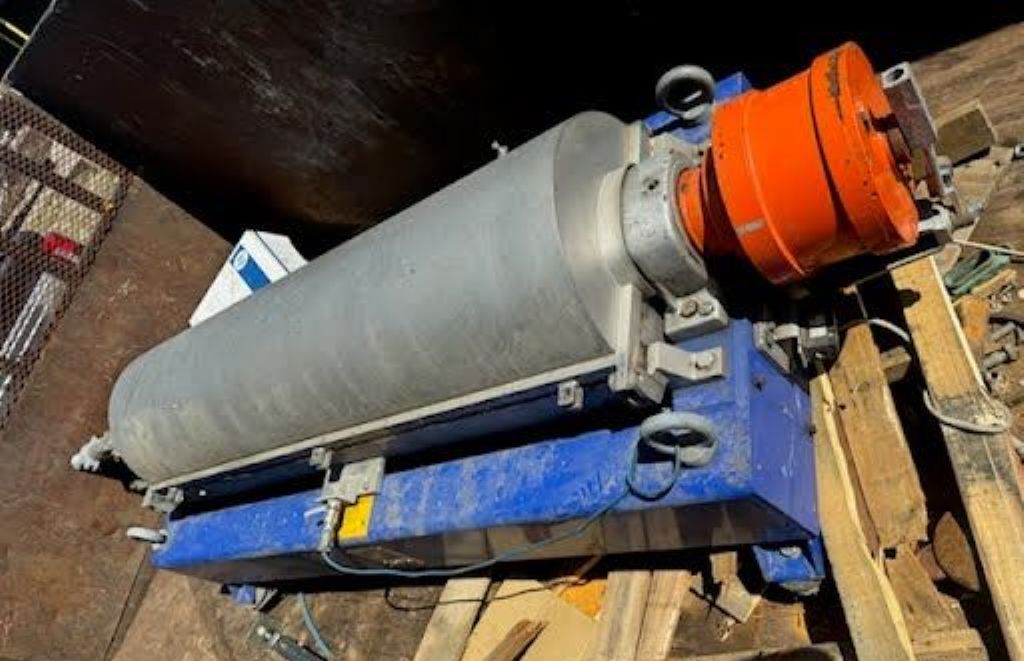 Max bowl speed 4000 RPM, 3158 x G, liquid discharged by gravity, 110mm hardsurfaced Esbjerg conveyor, 50 HP motor 230/460/3/60/1755 RPM, guards, 159:1 2.5 kNm gearbox, TA assembly, guards, feed tube, vibration switch/isolators and controls. 2011 vintage. Very good condition.