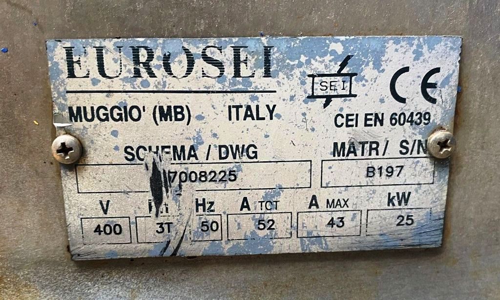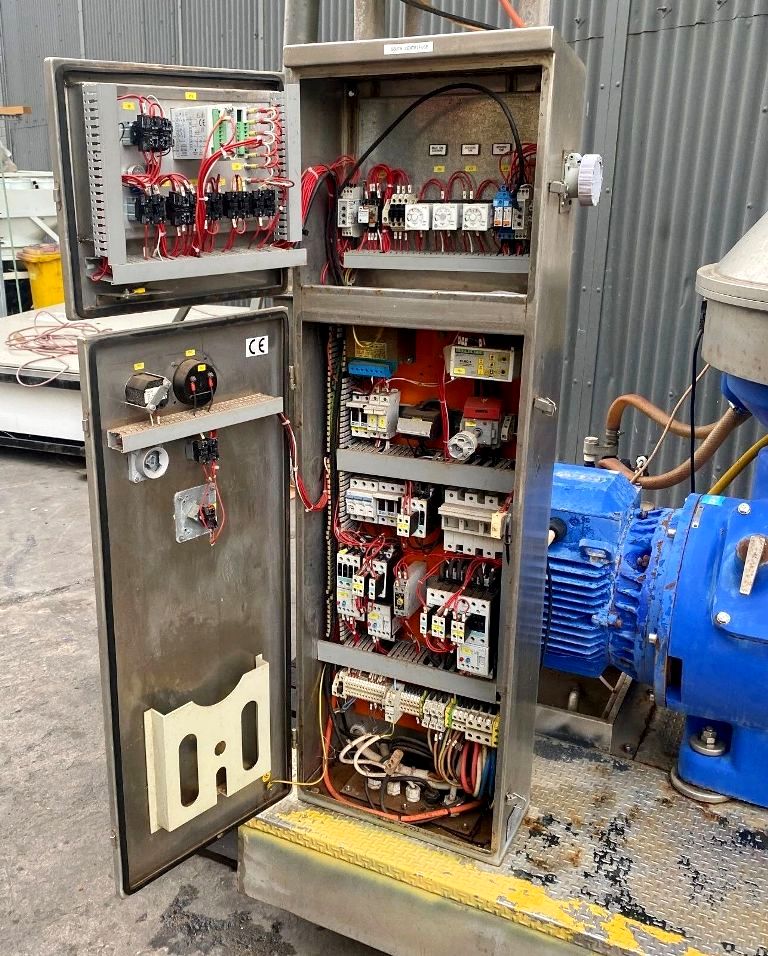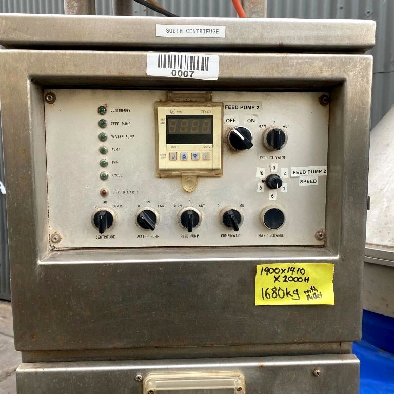 Max bowl speed 6240 RPM, timed solids discharge, liquid discharged under pressure, 22 KW motor 400/460/3/50/60, sludge cyclone, all valves, gauges, piping, feed pump, and control panel, unitized on a skid. 1992 vintage. Very good condition. Located in Australia.