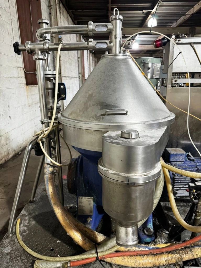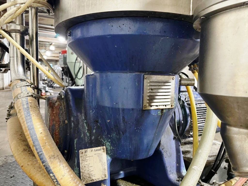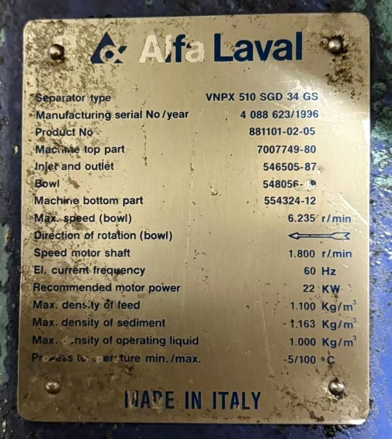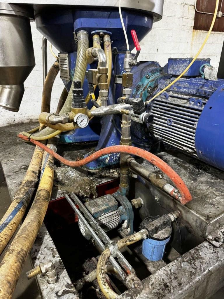 Max bowl speed 6235 RPM, timed solids discharge, liquid discharged under pressure, 22 KW motor 460/3/60/1750 RPM, sludge cyclone, all valves, gauges, piping, feed pump and control panel on a skid. 1996 vintage. Very good condition.