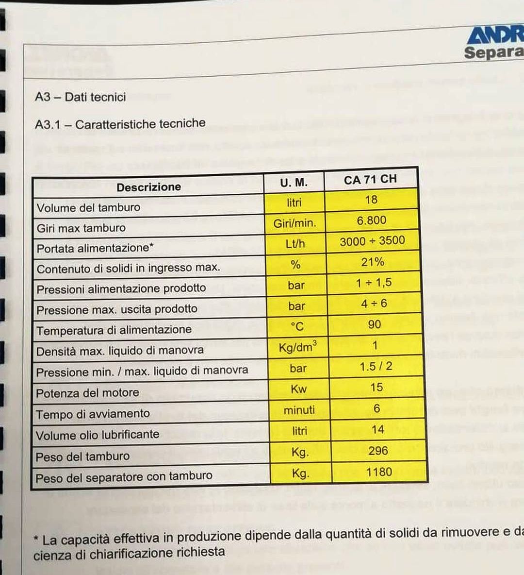 Max bowl speed 6800 RPM, rated @3500 LPH, 18 L bowl volume, 5 L sludge space, 6 Bar pressure. 15 KW motor 400/3/50/1450 RPM, mounted on SS skid with control panel and SIP module. 2017 vintage. Excellent condition, never used. Located in Europe.