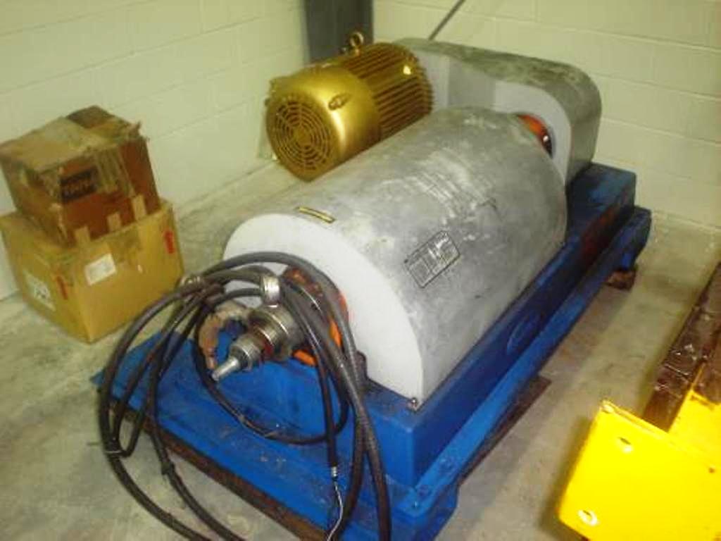 Max bowl speed 5000 RPM, 4400 x G, 12.6" x 36" bowl ID, effluent discharged under pressure. 2.5" double lead hardsurfaced conveyor, 15 HP motor 460/3/60/3600 RPM, 35:1 cyclo gearbox, belt guard, feed tube, vibration switch/isolators and control panel. Reconditioned and unused since.
