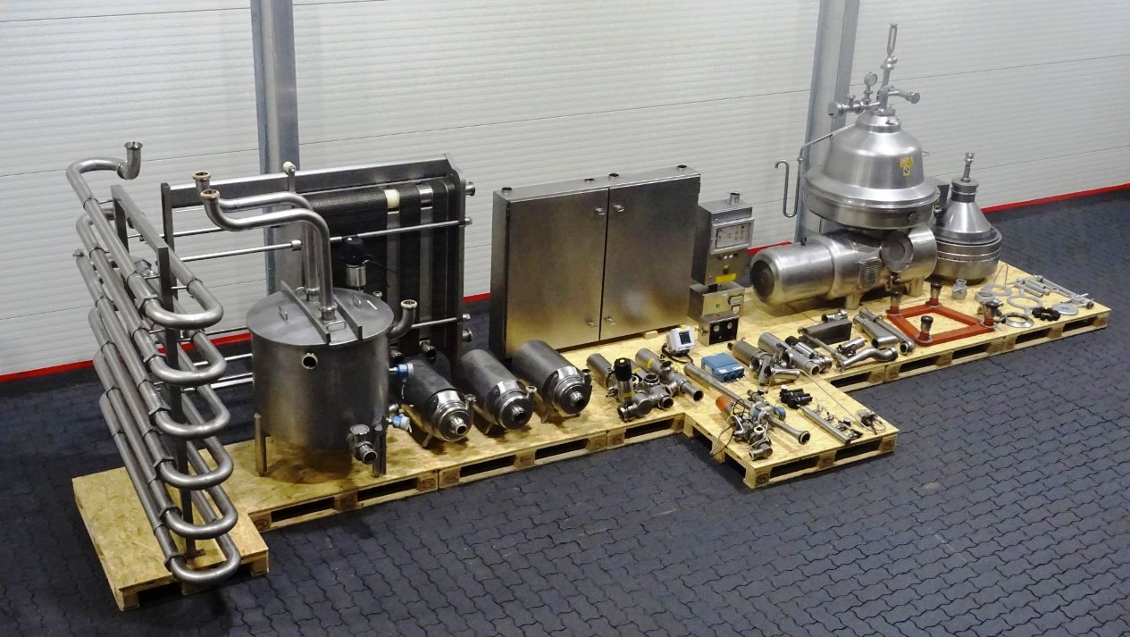 Includes APV N35 RKS plate heat exchanger for milk (4 sections), rated @ 25,000 LPH, 6 bar pressure, 2004 vintage. APV Puma product and booser pumps, Rosemount and Yogakawa digital flow transmitters. Westfalia MSA 200-01-076 milk separator, max bowl speed 4700 RPM, rated @ 25,000 LPH skimming, 37 KW motor 420/3/50/1475 RPM, counter pressure valve on inlet, manometer, manual flow regulation valve and flow indicator for cream, water valves, foundation frame, sludge tank, all inlet/outlet piping, tools and control panel. 1980 vintage. Very good condition. Located in Europe.