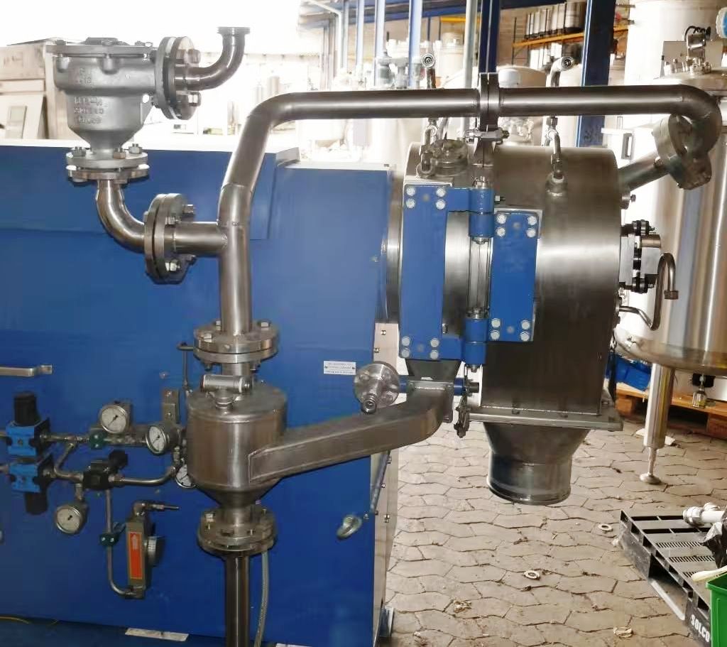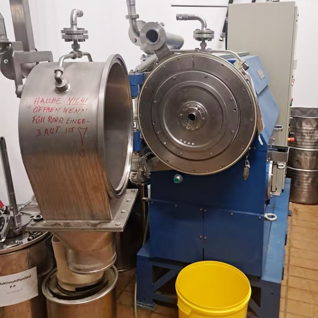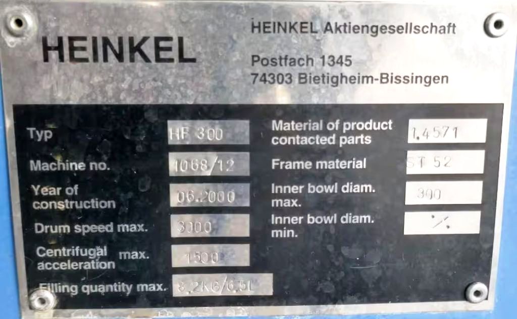 Equipped with a powerful 4 KW explosion-proof hydraulic motor operating at 380/3/50/2875 RPM, the Heinkel HF 300 delivers reliable and consistent performance. Additionally, the 1 KW explosion-proof pump motor enhances the system's efficiency, ensuring that the feed material is effectively introduced into the centrifuge for optimal separation. The included control panel and manuals facilitate user-friendly operation and maintenance, allowing operators to monitor and adjust settings with ease. This centrifuge, dating back to 2000, has been maintained in excellent condition, making it a valuable asset for any facility looking to enhance their separation capabilities. Located in Europe, it is readily available for industries seeking to improve their production processes with a reliable and efficient centrifuge.