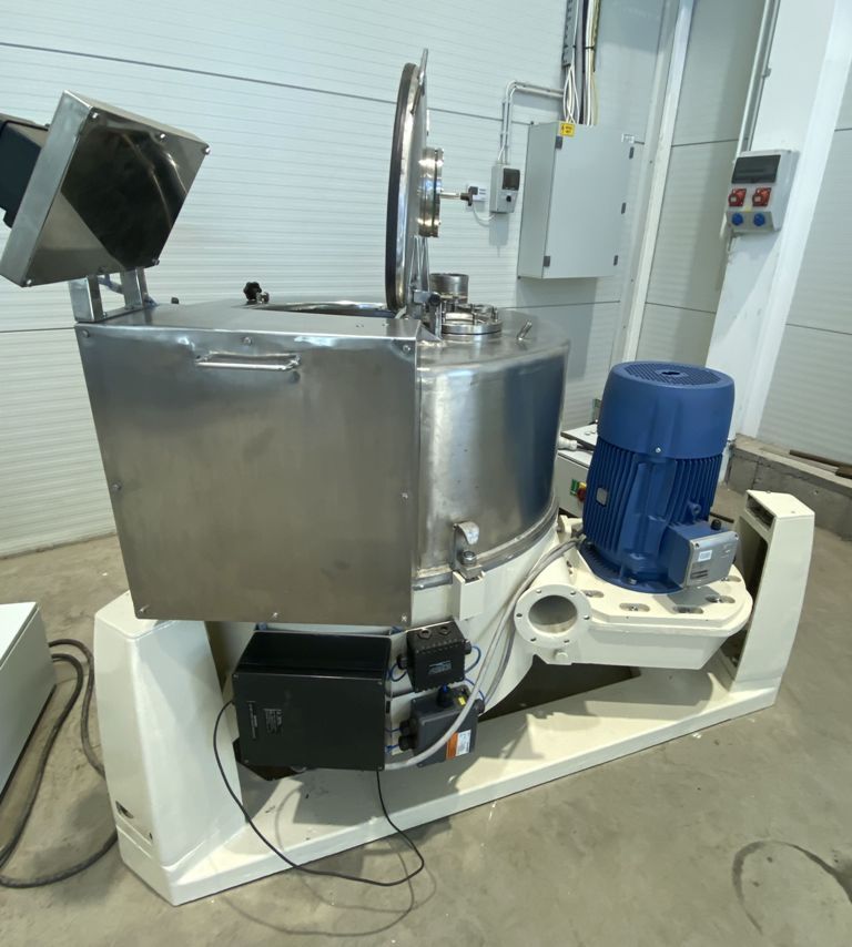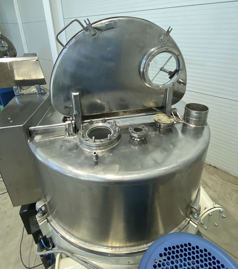 Max bowl speed 880 RPM, 500 x G, 1000 x 450mm basket ID, sanitary design, top unload, filtration area 1.4 sqM, volume 200 L, max load 200 kg, 18.5 KW ATEX motor 380/3/50/1440 RPM, sight glasses, feed, rinse and wash pipes with control panels. 2024 vintage. Like new. Located in Europe.