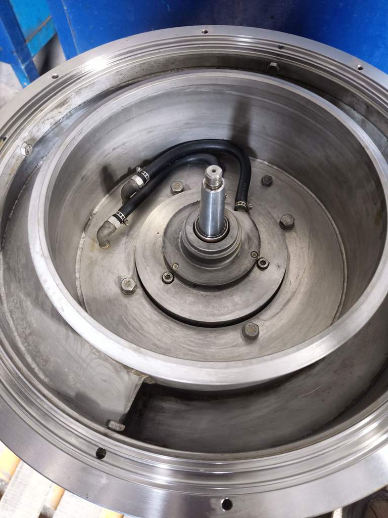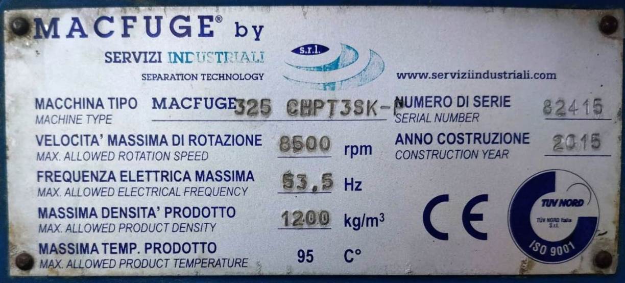 Max bowl speed 8500 RPM, rated @ 5,000 LPH, 10 L bowl volume, 5 L solids capacity, both liquid phases discharged under pressure. 5.5 KW motor 440/3/60/1756 RPM, tools, manual and drawings. 2015 vintage. Excellent condition. Located in South America.