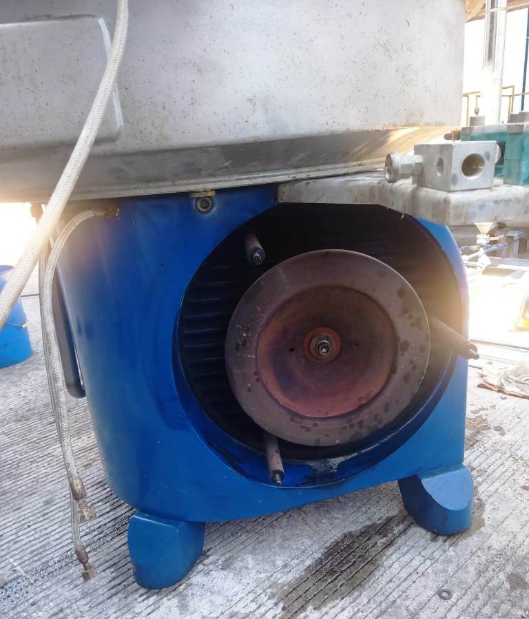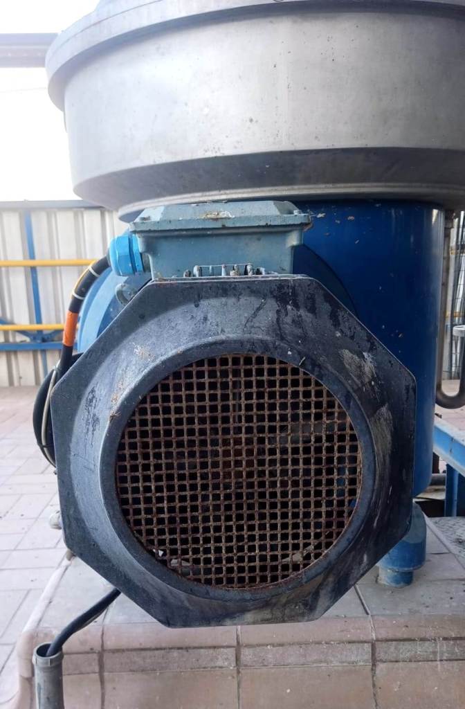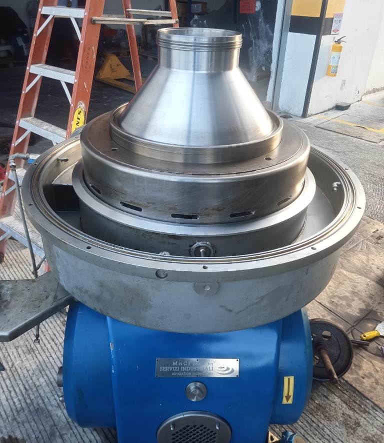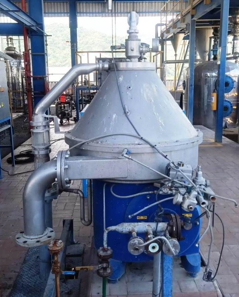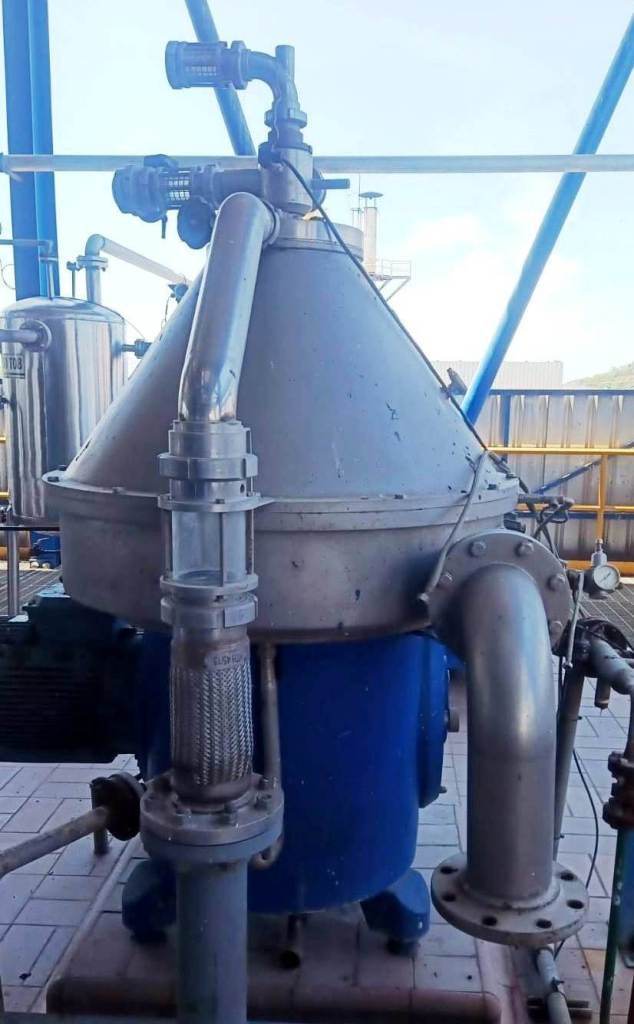 Max bowl speed 5300 RPM, rated @ 450-500 TPD, 40 L bowl volume, 15 L solids capacity, both liquid phases discharged under pressure. 30 KW motor 440/3/60/1776 RPM, tools, manual and drawings. Prior use: crude palm oil degumming and neutralization. 2015 vintage. Very good condition. Equivalent to GEA Westfalia RSE 170-01-076. Located in South America.