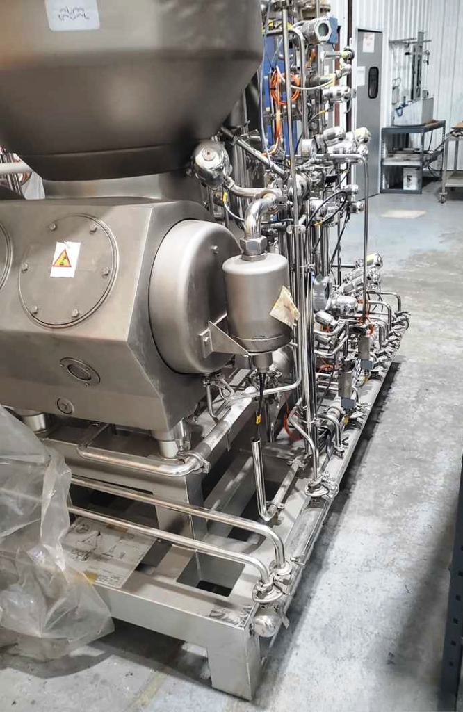 Max bowl speed 7200 RPM, 11,900 x G, rated @ 5000 LPH, bowl volume 15 L, steam sterilizable, hermetic design, jacketed bowl, liquid phase discharged under pressure. 22 KW motor 460/3/60, sludge tank, flow meter, lobe pump, PLC control panel with touch screen HMI, unitized an a SS skid with tools, spare parts and all documentation. 2020 vintage. Never used. Equivalent to: BTPX 810 HGV-34C.