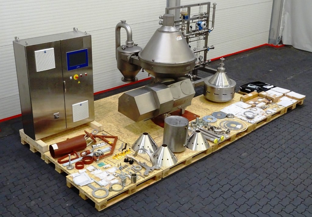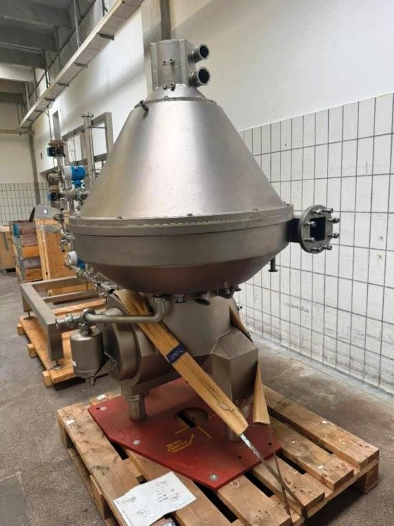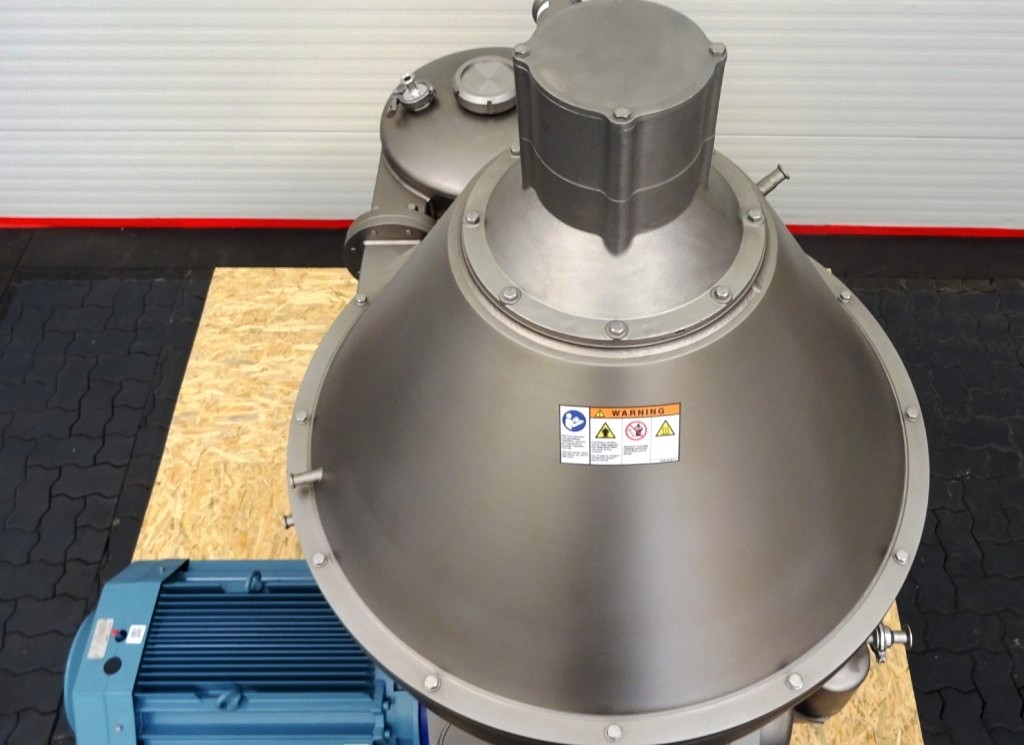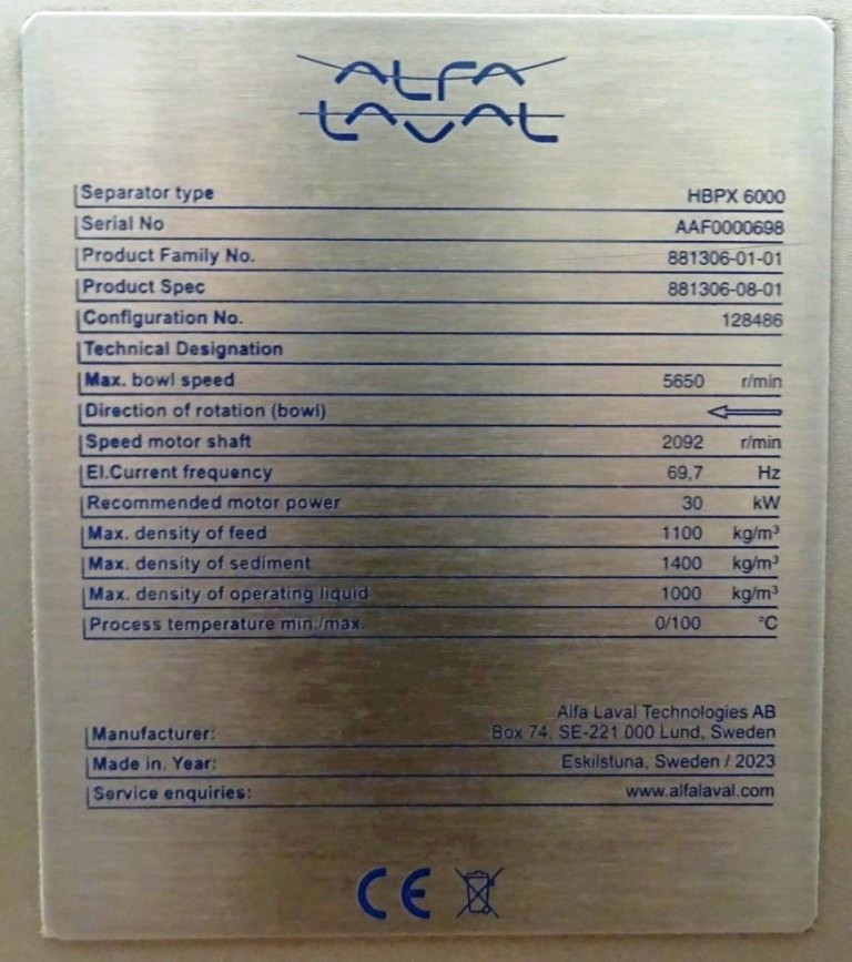 Max bowl speed 5650 RPM, rated @ 6000 LPH, bowl volume 34 L, both liquid phases discharged under pressure via adjustable Centrizoom paring disc. 37 KW motor 400/690/3/50/1481 RPM, sludge cyclone, water harness, base frame, all valves, gauges and piping, tools, spare parts, manuals, standard process liquid unit mounted on a SS skid and PLC control panel with VFD and touch screen HMI. 2023 vintage. Never used. Located in Europe.