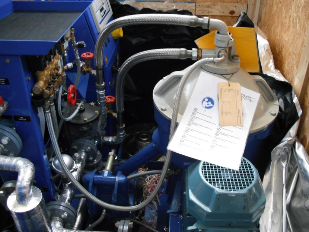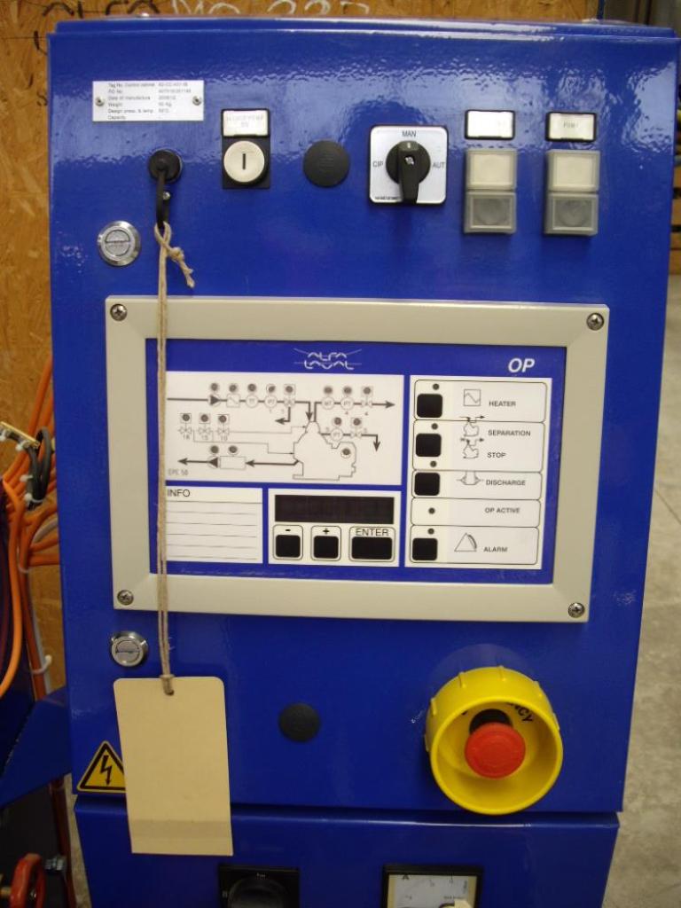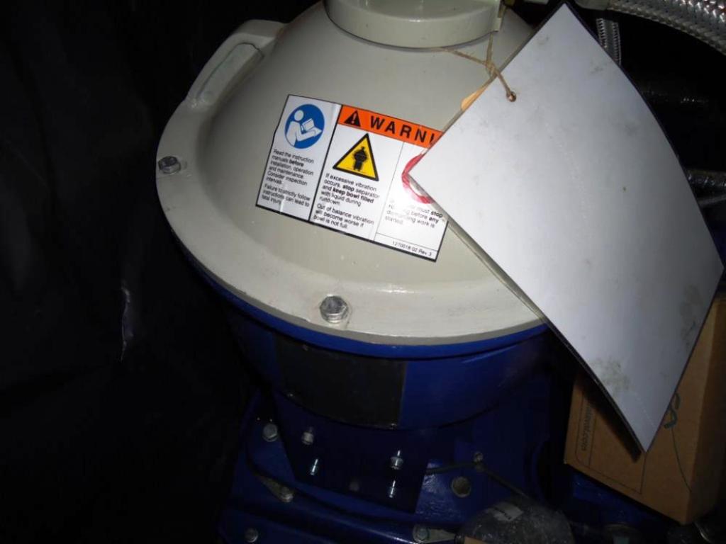 Max bowl speed 12,088 RPM, both liquid phases discharged under pressure, rated @ 2400 LPH on light viscosity oil (380 cSt @ 50C). 5.5 KW motor 380/3/50/2860 RPM, tools, feed pump, 22 KW heater, water harness and control panel. Never used.