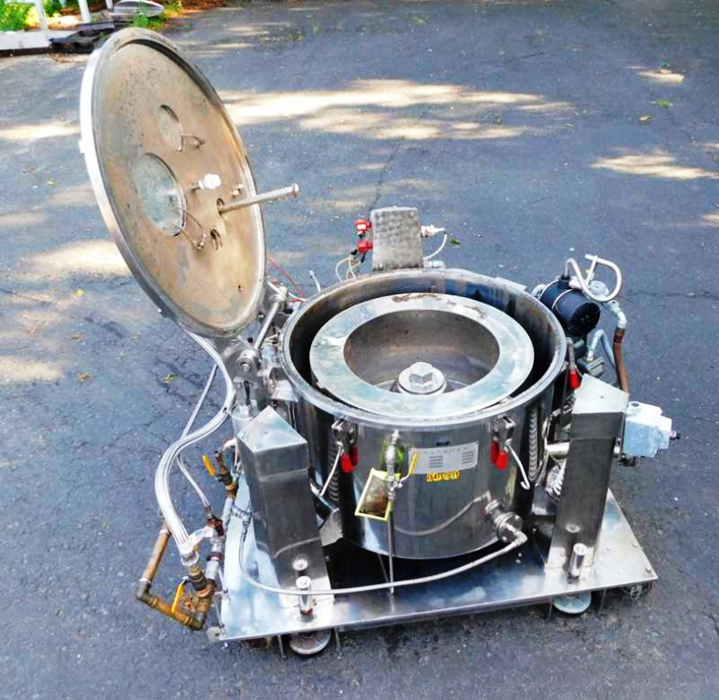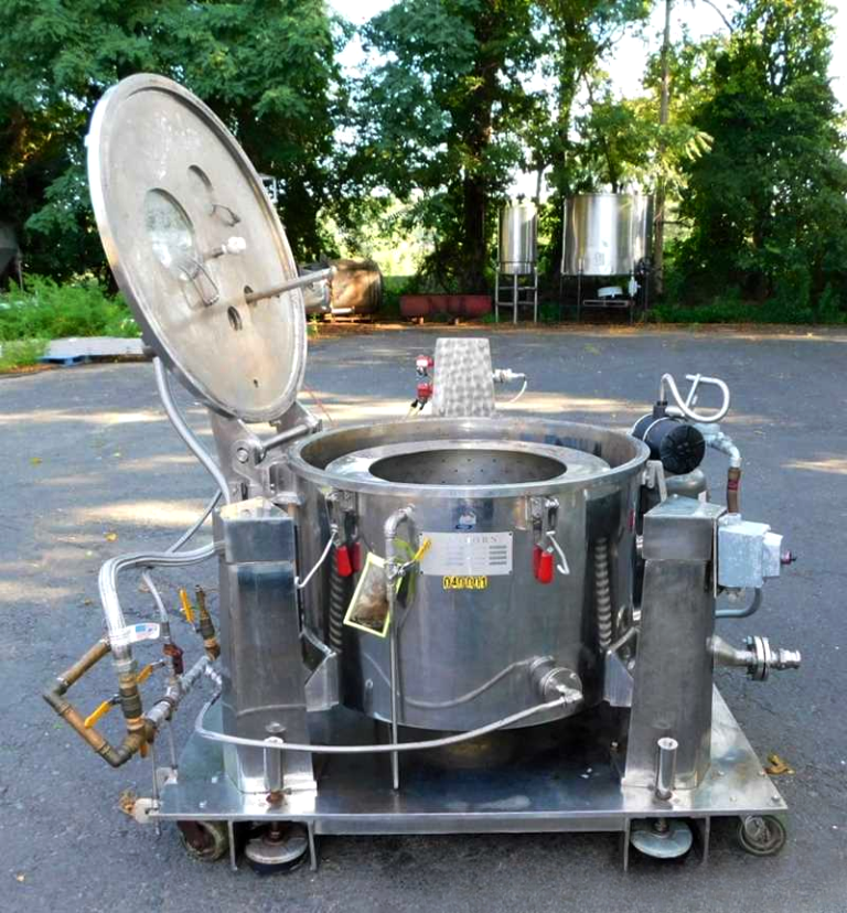 Max bowl speed 1450 RPM, 896 x G, 3.6 cuft capacity, 10.5 sqft filtration area, max load 342 lbs. Pharmaceutical grade, gastight design. 10 HP XP motor 230/460/3/60/1750 RPM, hinged top lid with toggle latches, 2 sight glasses, rotary spray ball, rapid gas purge system, liquid discharge pipe, mounted on SS base with casters and screw down floor pads, full documentation and original manual. Prior use: food processing. 2000 vintage. Very good condition.