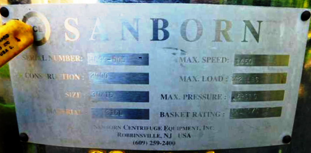 Equipped with a robust 10 HP XP motor, the Sanborn centrifuge operates at 230/460 volts and 60 Hz, providing reliable power for demanding tasks. The hinged top lid with toggle latches facilitates easy access for maintenance and cleaning, while the inclusion of two sight glasses allows operators to monitor the separation process without interrupting workflow. The rotary spray ball and rapid gas purge system further enhance the cleaning efficiency, ensuring that the equipment remains hygienic and compliant with industry standards. Mounted on a stainless steel base with casters and screw-down floor pads, this centrifuge offers mobility and stability, making it adaptable to various production environments. With full documentation and the original manual included, users can be assured of a straightforward setup and operation.