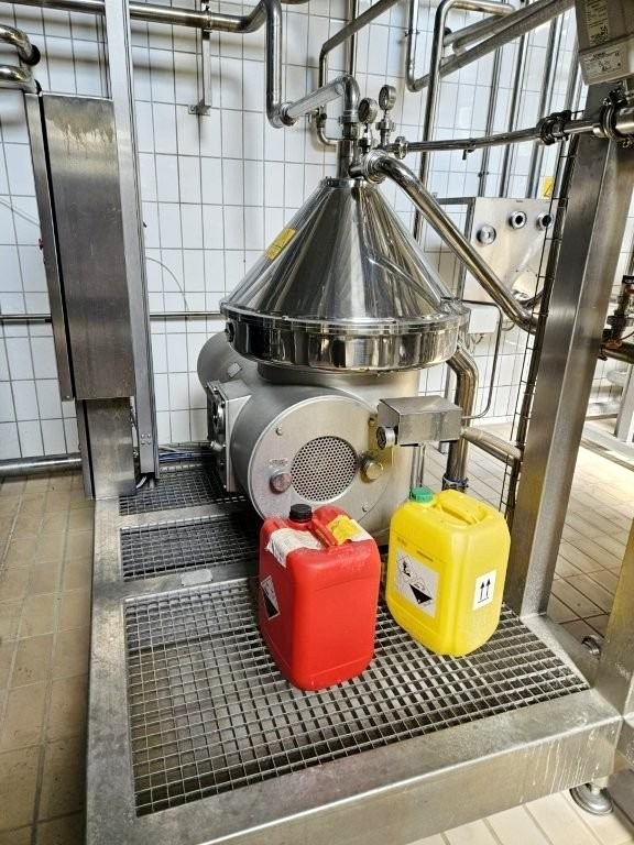 Max bowl speed 6500 RPM, milk skimming 18,000 LPH. 22 KW motor 380/3/50/1450 RPM, all valves and piping, unitized on SS skid with control panel, tools and manuals. Excellent condition. Located in Europe.