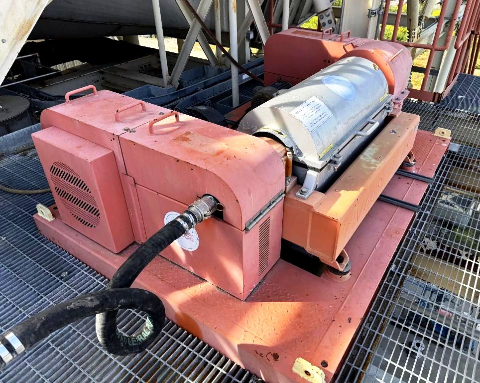 Max bowl speed 3300 RPM, 2150 G's, 14" x 34" bowl ID. 5" single lead STC-tiled conveyor, 25 HP XP motor 230/460/3/60/1775 RPM, gearbox, 7.5 HP XP backdrive, guards, feed tube and vibration isolators, mounted on an oilfield skid. No controls. 2014 vintage. Excellent condition.