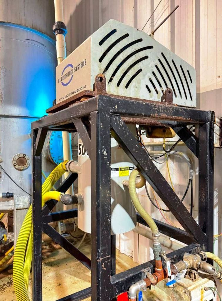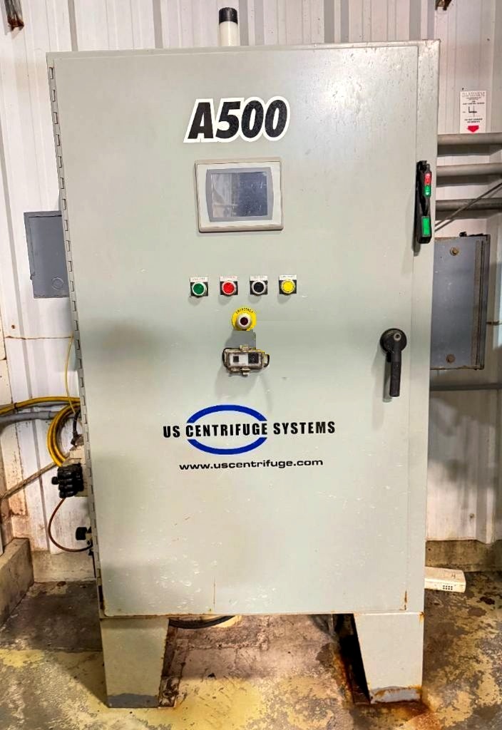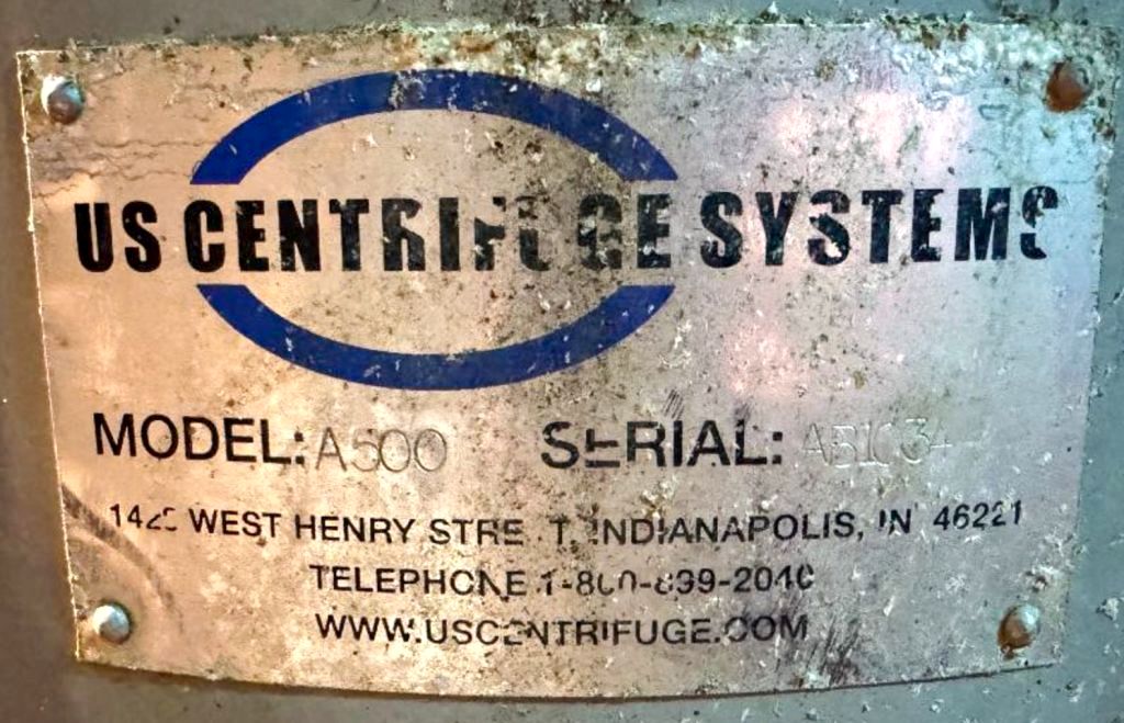The US Centrifuge A500 self-cleaning centrifuge is designed for high-performance separation in various industrial applications. With a maximum bowl speed of 3600 RPM and the ability to generate forces up to 2000 x G, this centrifuge is engineered to handle demanding processes efficiently. Rated at 20 gallons per minute (GPM), it boasts a solids holding capacity of 2 gallons, making it suitable for applications that require continuous operation without frequent interruptions for maintenance. The robust 5 HP motor operates at 230/460 volts, 3-phase, 60 Hz, and 1750 RPM, ensuring reliable performance in various settings. The unitized design, which includes a stand with an integrated holding tank, pumps, and a PLC control panel, simplifies installation and reduces the need for additional equipment, allowing for a more streamlined setup in your facility.