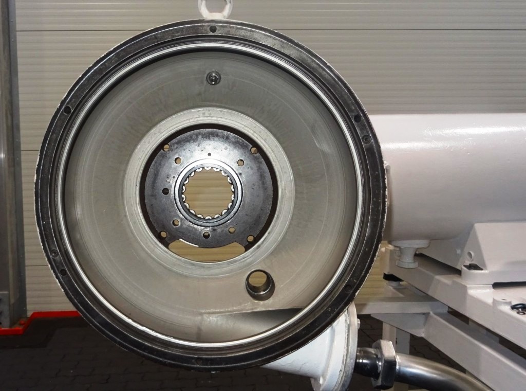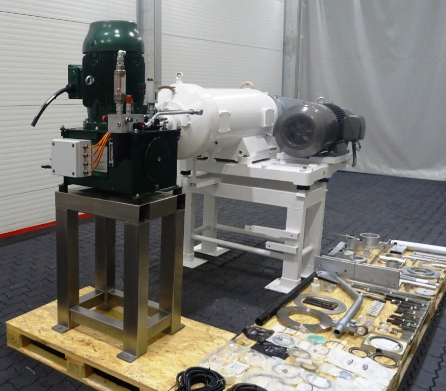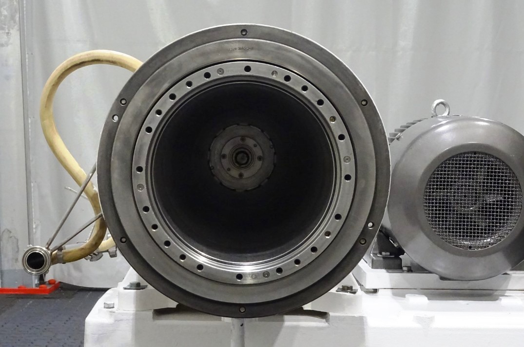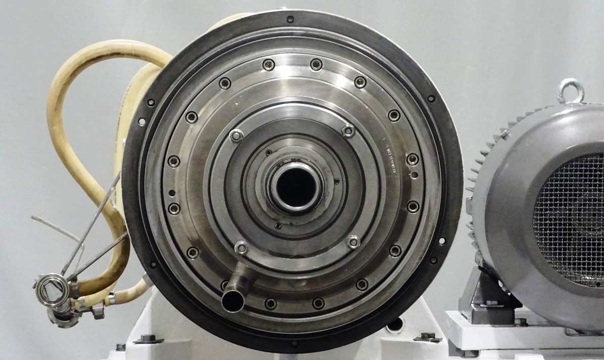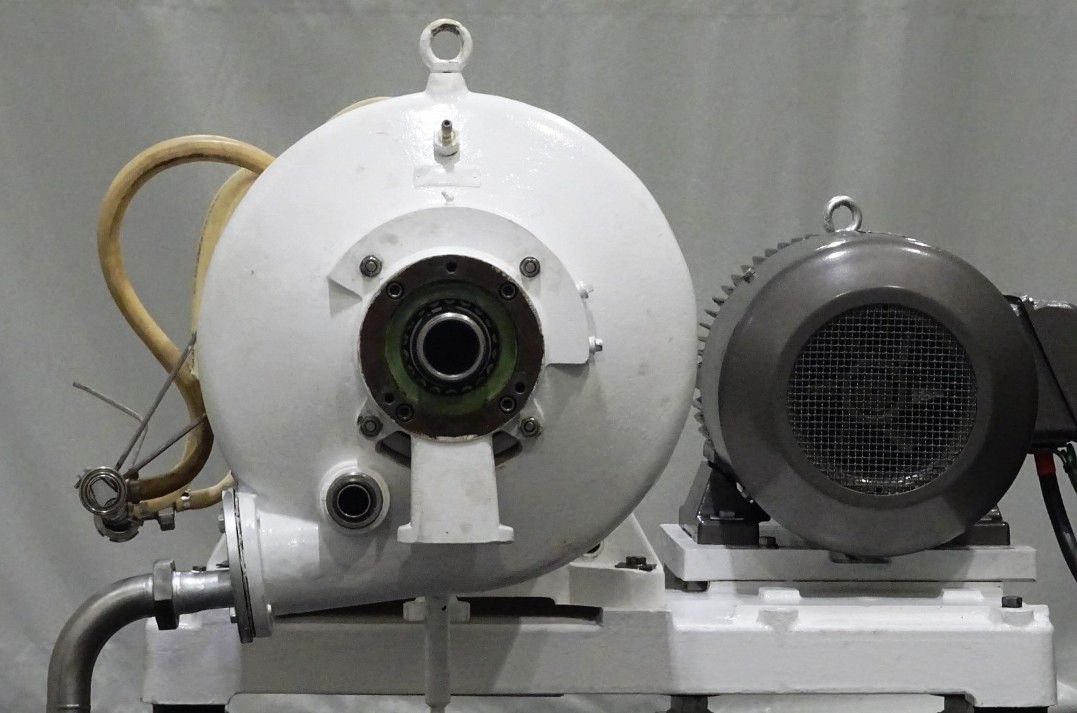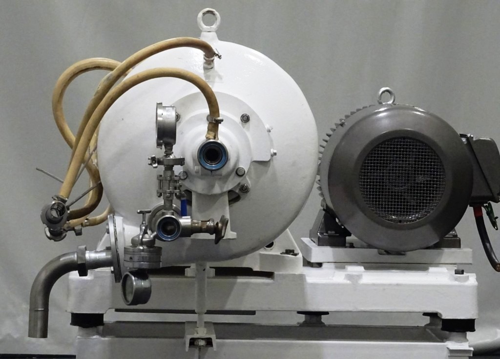 Max bowl speed 4000 RPM, rated @ 55 GPM, pressure discharge design, 8 degree contour bowl. 30 KW motor 420/3/50/2930 RPM, 18.5 KW Viscotherm hydraulic backdrive system, feed tube, guards and chutes, mounted on a stand. Prior use: Casein. 1981 vintage. Excellent condition.