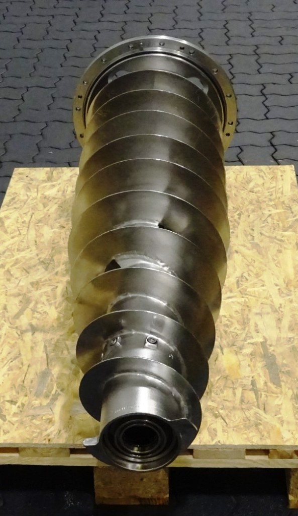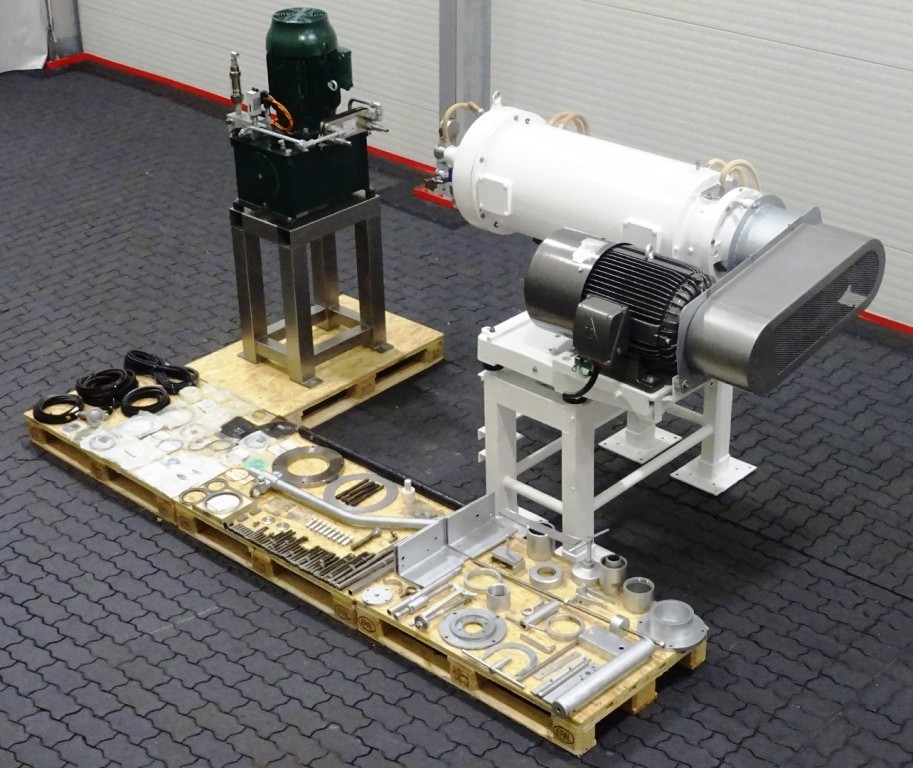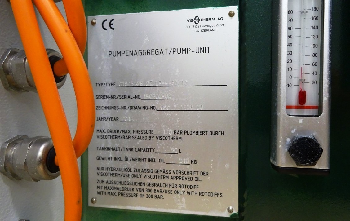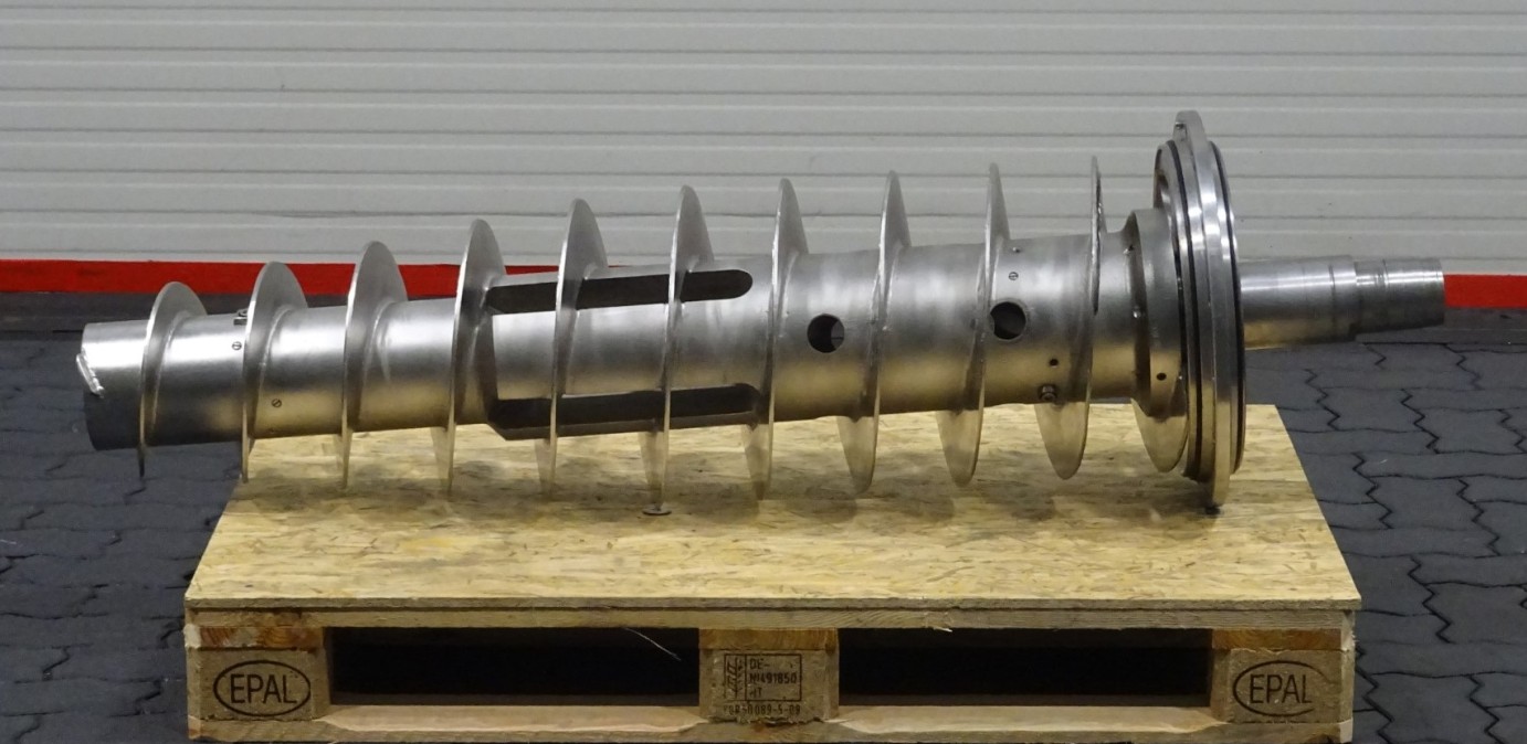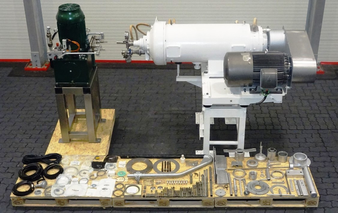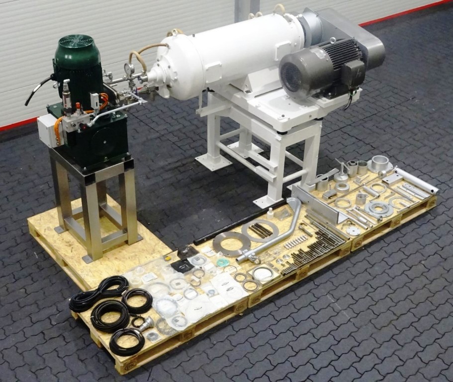 Max bowl speed 4000 RPM, rated @ 55 GPM, pressure discharge design, 8 degree contour bowl. 30 KW motor 420/3/50/2930 RPM, 18.5 KW Viscotherm hydraulic backdrive system, feed tube, guards and chutes, mounted on a stand. Prior use: Casein. 1981 vintage. Excellent condition.