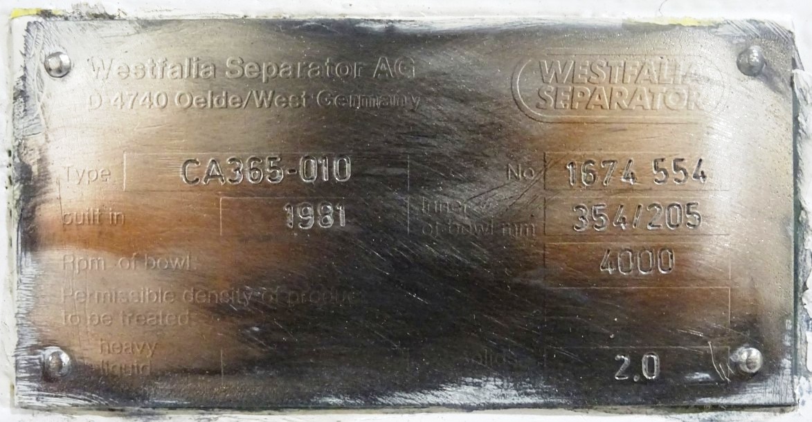 Additionally, the Westfalia CA 365-010 features an 18.5 KW Viscotherm hydraulic backdrive system, which allows for precise control over the centrifuge's operation. This system is particularly beneficial for managing varying feed conditions, ensuring consistent performance regardless of fluctuations in material viscosity. The inclusion of a feed tube, guards, and chutes enhances the safety and usability of the centrifuge, while the sturdy stand provides stability during operation. Given its prior use in casein processing, this centrifuge has been maintained in excellent condition, making it a reliable choice for businesses looking to enhance their production capabilities. Its 1981 vintage does not detract from its performance; rather, it reflects the enduring quality and craftsmanship associated with Westfalia products.