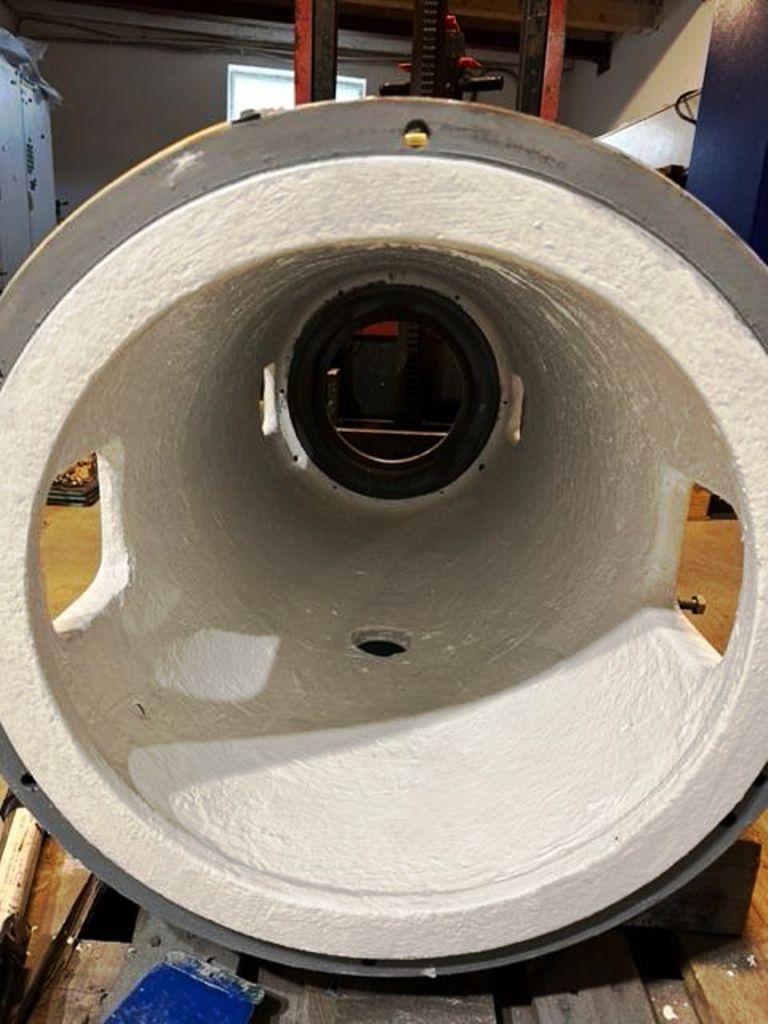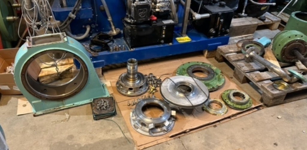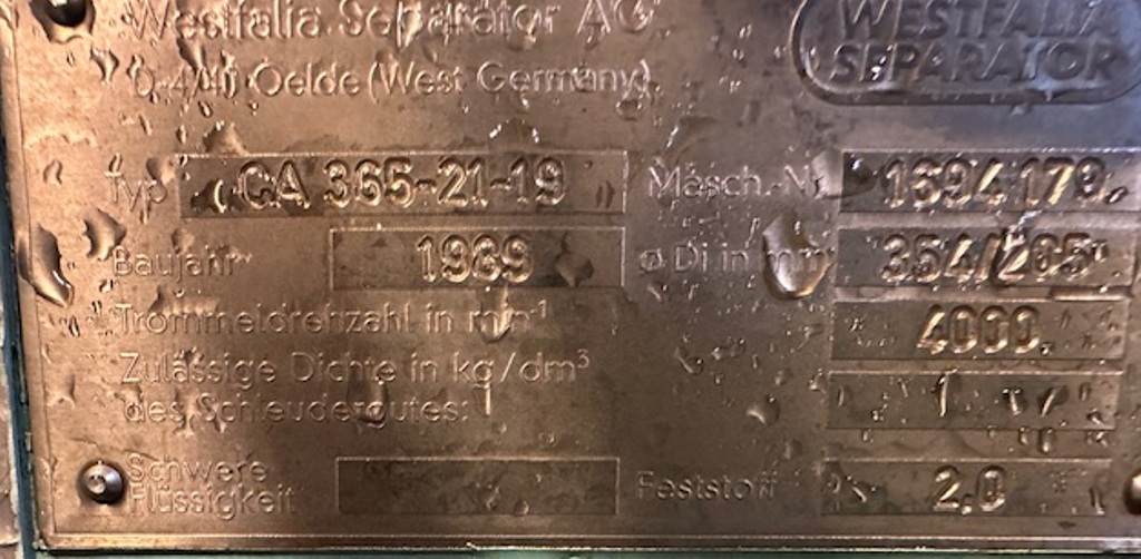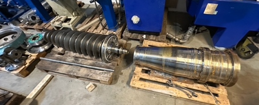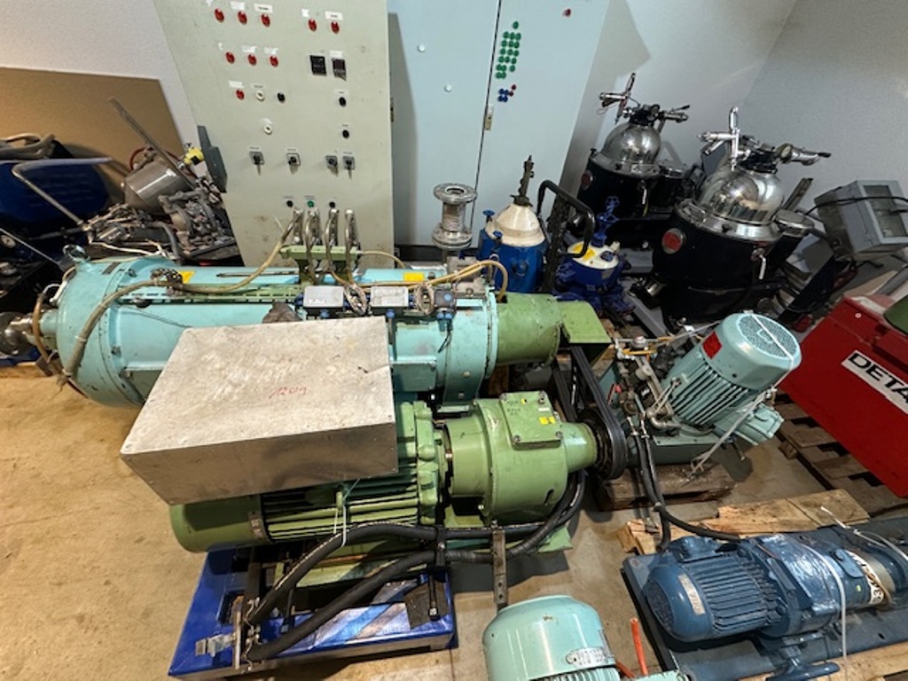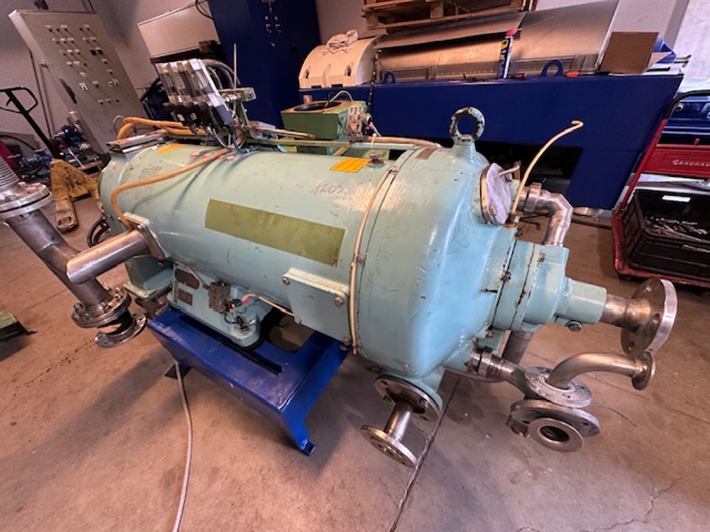 Max bowl speed 4000 RPM, 3180 x G, 8 degree beach angle, effluent discharged under pressure, 110mm single lead hardsurfaced conveyor, 30 KW XP motor 600/3/50/2980 RPM, Viscotherm ATEX hydraulic backdrive system, lube system, guards, feed tube, vibration isolators/switch and chutes, mounted on a stand with control panel. 1989 vintage. Reconditioned. Located in Europe.