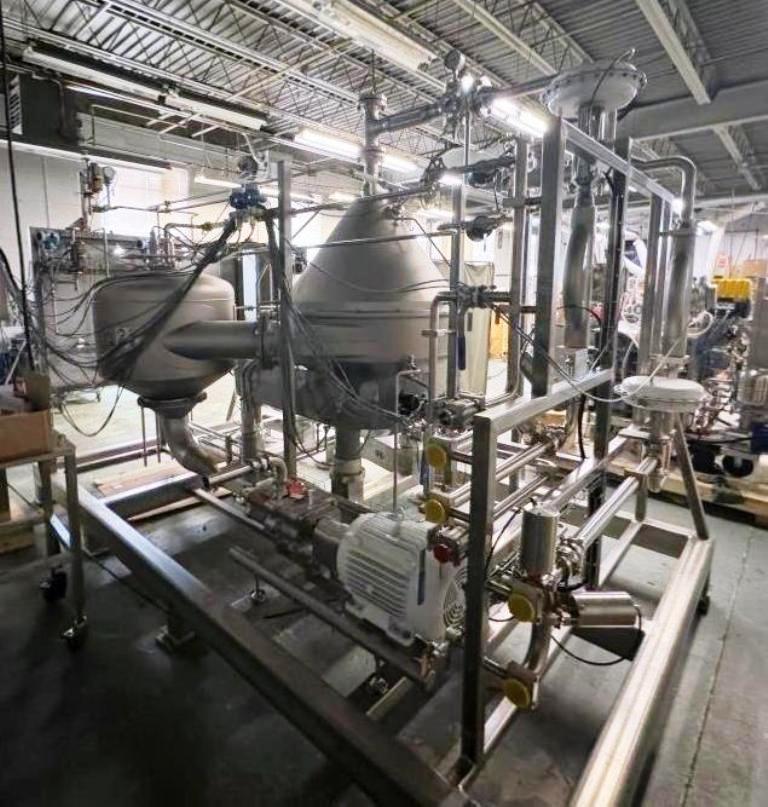 Max bowl speed 4800 RPM, rated @ 15,000 LPH, bowl volume 60 L, sludge cap 24 L. 75 KW motor 460/3/60/1775 RPM, sludge cyclone, water harness, all valves and piping, vibration switch/isolators, Seepex pump, tools and PLC control panel, unitized on a SS skid. 2024 vintage. Never used.