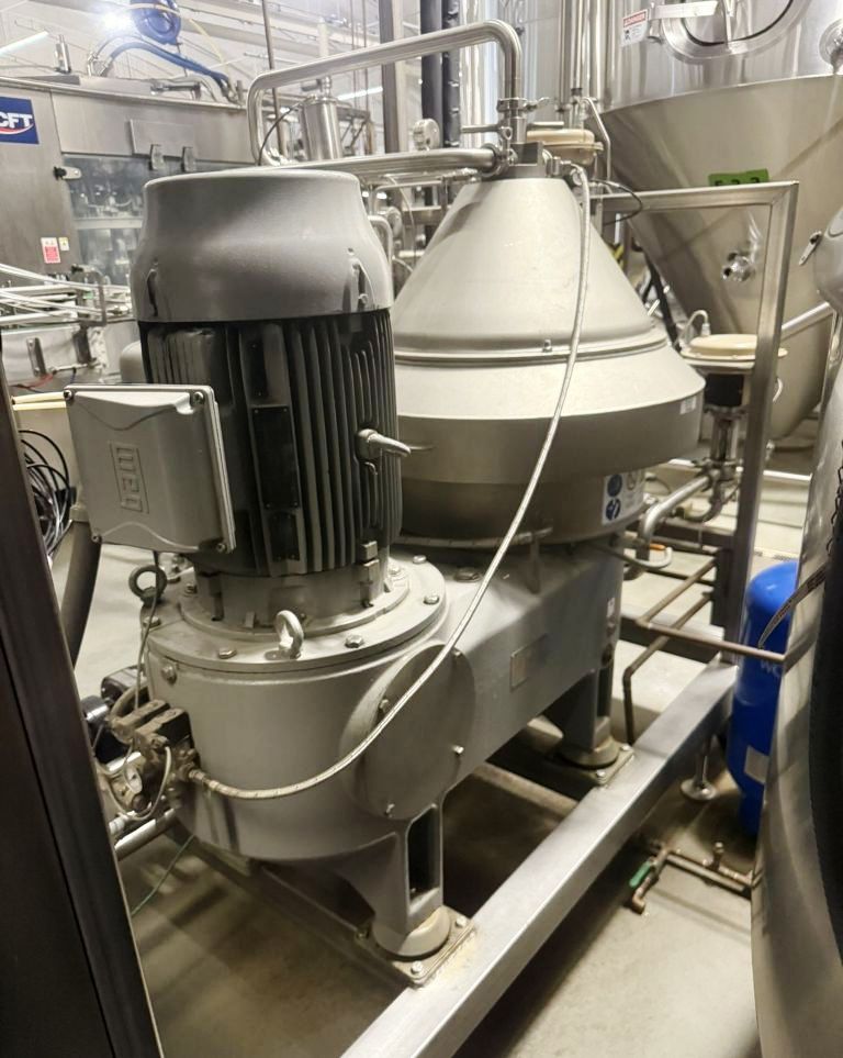 Max bowl speed 6800 RPM, rated @ 26,000 LPH, 8.5 L solids capacity, 6 bar. 30 KW motor 380/660/3/50/1470 RPM, flow meter, valves, hydro cyclone, mono sludge pump, Allen Bradley PLC control panel with PanelView 1000 Color Touch Screen HMI and tools, unitized on a skid. Prior use: Brewery. 2015 vintage. Excellent condition.