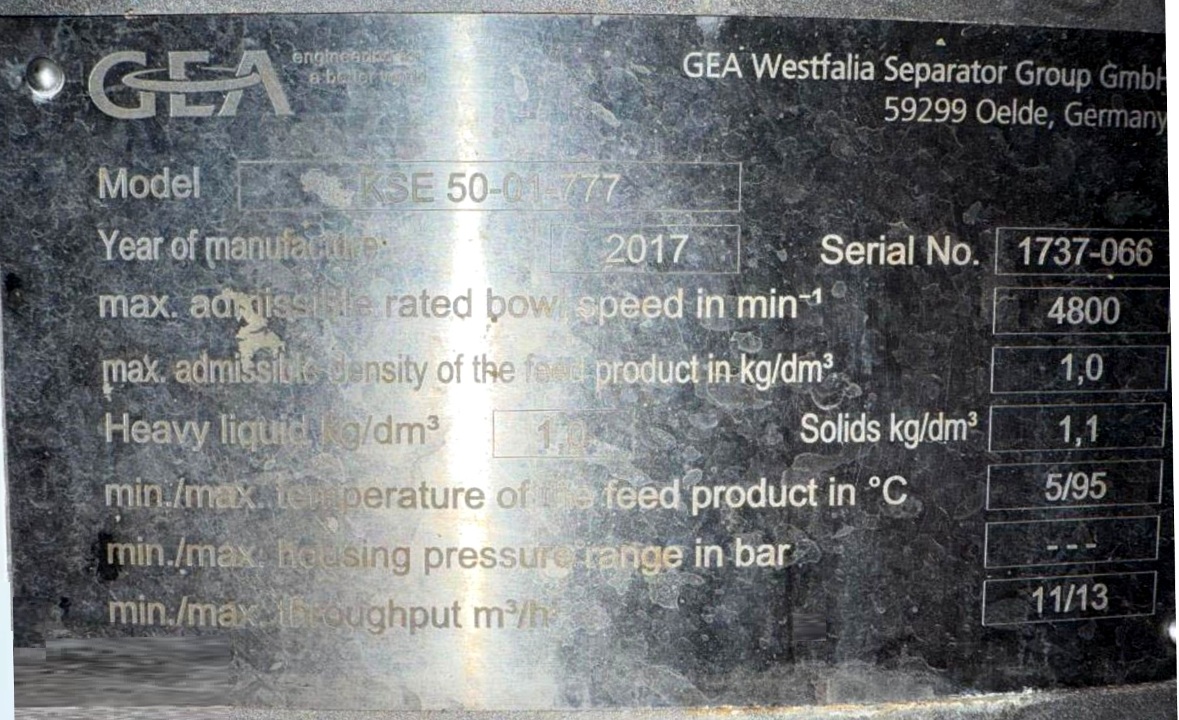 Max bowl speed 4800 RPM, rated @ 4500 LPH, 60 KW motor 460/3/60/1750 RPM, balance tank, flow meter, water harness, PLC control panel with Allen-Bradley PanelView Plus 1000 touch screen HMI, Fristam FPX 3541 centrifugal pump, all interconnecting pipes and valves. 2017 vintage. Very good condition. ***MISSING MOTOR***