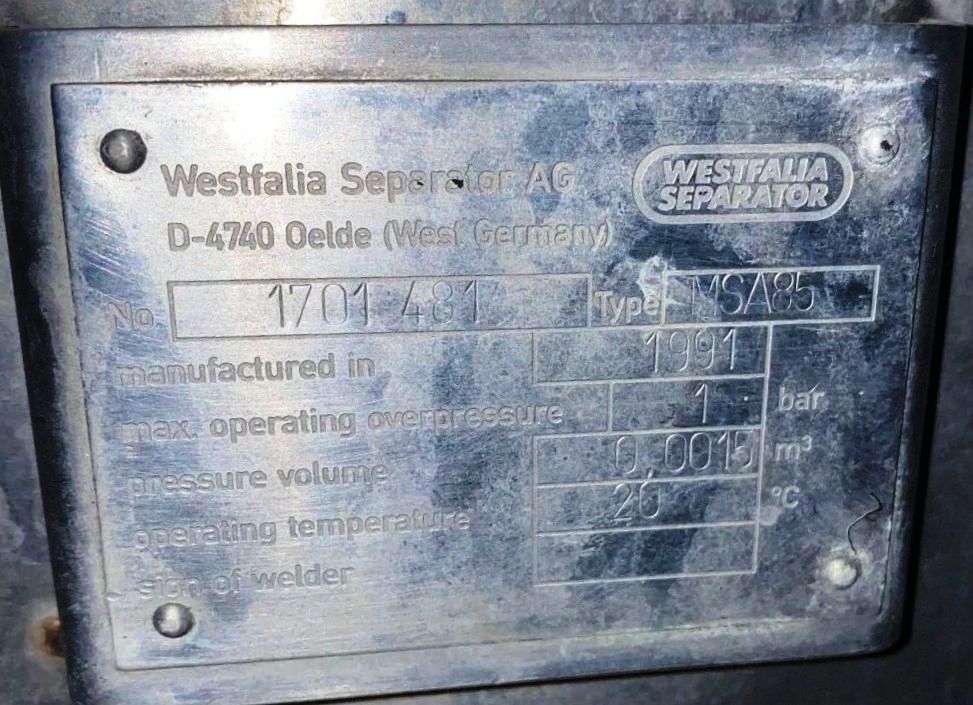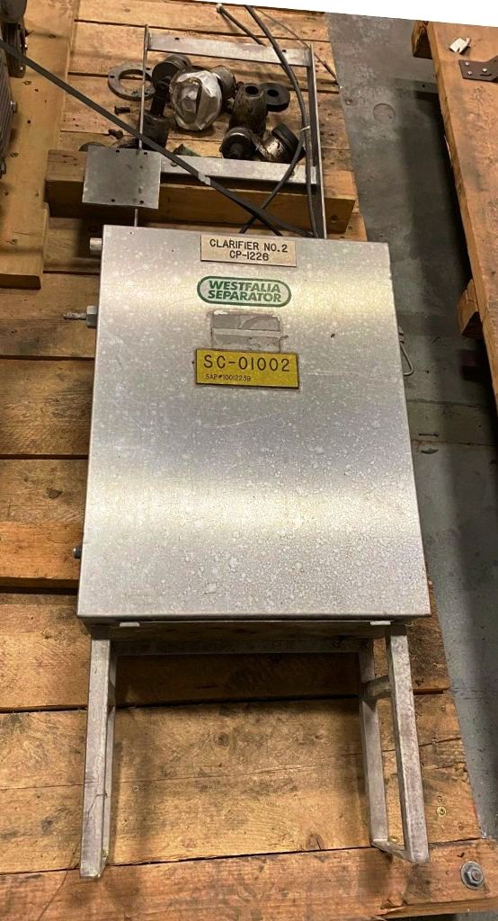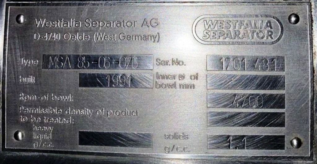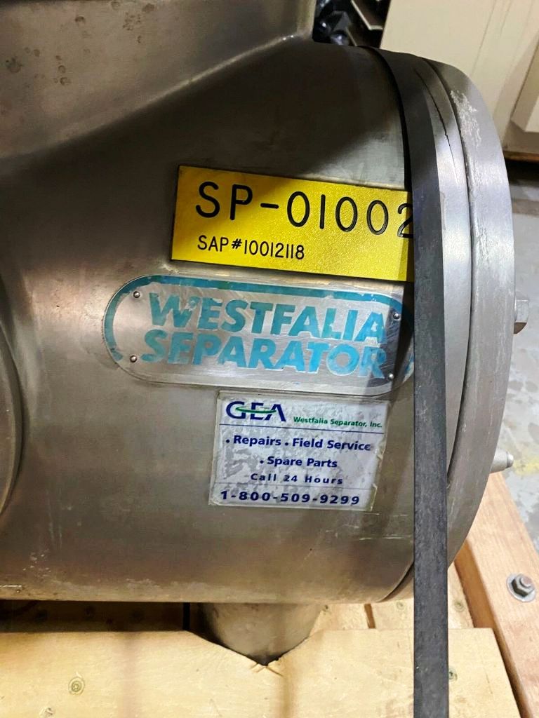 Max bowl speed 4700 RPM, rated @ 35,000 LPH. 50 HP motor 460/3/60/1775 RPM, sludge tank, feed valve, pressure gauge, flow meter and control panel. 1991 vintage. Very good condition.