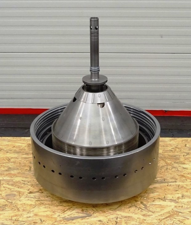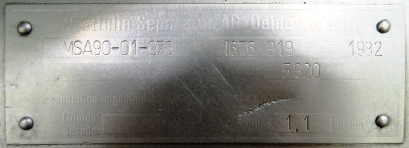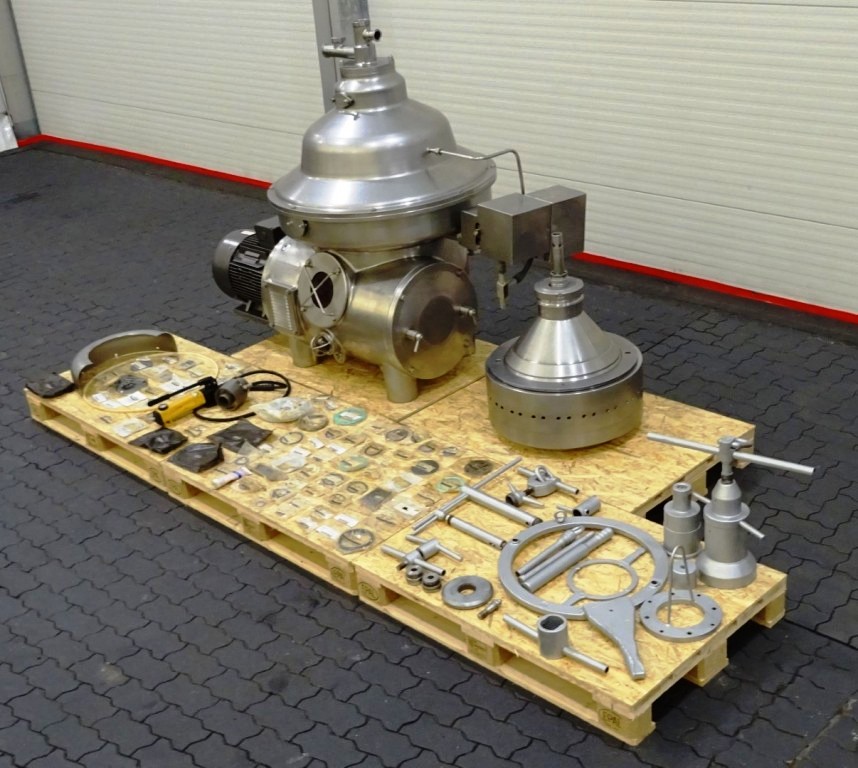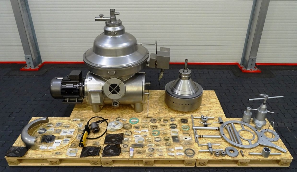 Max bowl speed 5920 RPM, rated @ 10,000 LPH on hot milk. 18.5 KW motor 230/460/3/50/1770 RPM, water valves, all inlet/outlet pipes, tools and several spare parts. 1982 vintage. Very good condition. Located in Europe.