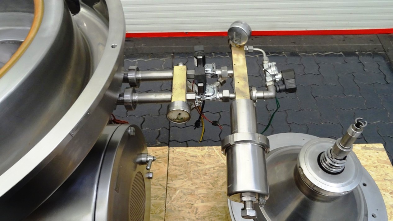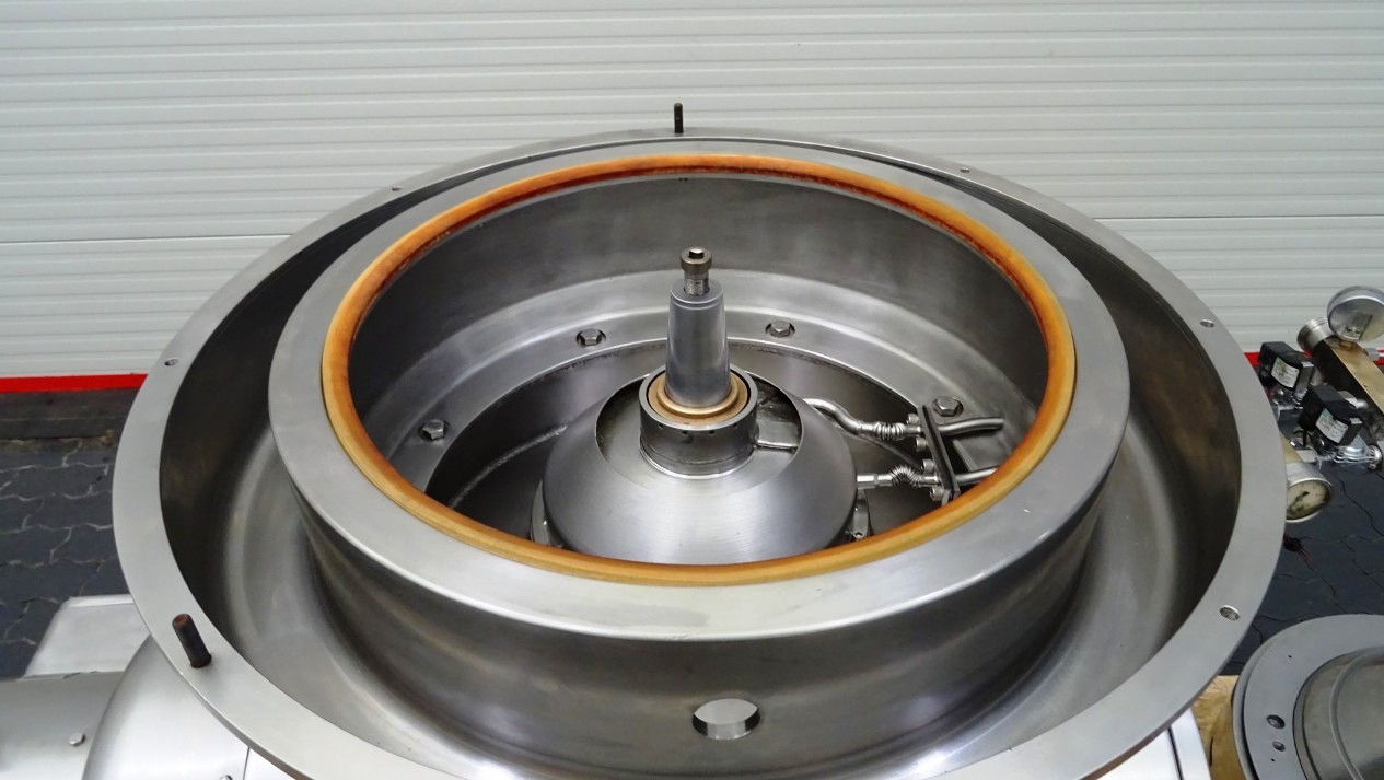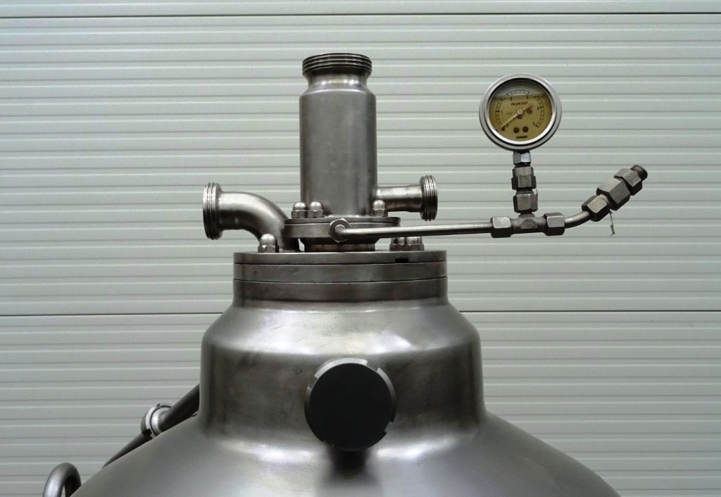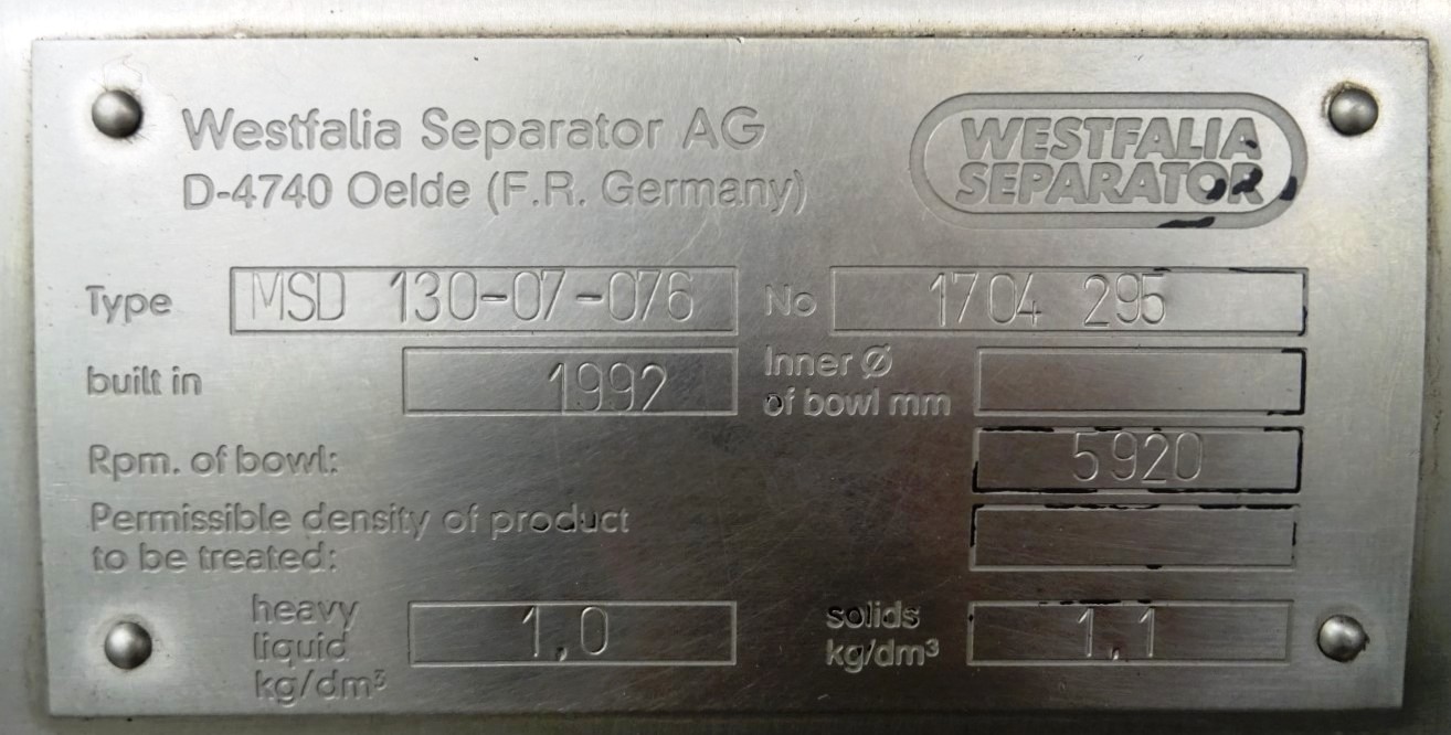 Max bowl speed 5920 RPM, rated @ 15,000 LPH. Special design with hermetic cream outlet (no pump) for cold skimming, therefore the cream is discharged without damaging the fat globules, even at low temperatures. 26 KW motor 380/3/60/1750 RPM, water valves, constant pressure valve 3 bar, monometer on outlet, base frame and tools. 1992 vintage. Excellent condition. Located in Europe.