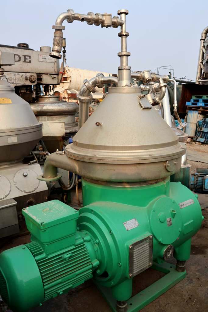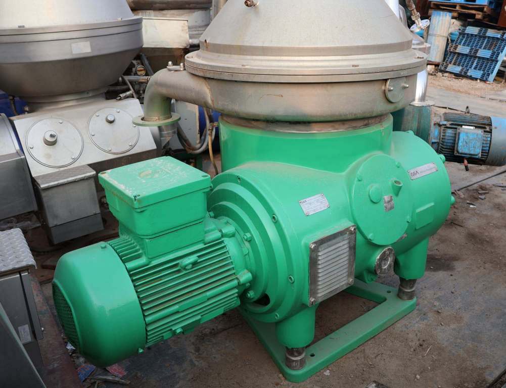 The Westfalia RSA 60-01-076 vegetable oil separator, 316SS. is engineered for high-efficiency separation of vegetable oils, making it an essential piece of equipment for industries focused on oil processing and purification. With a maximum bowl speed of 6330 RPM and a centrifugal force of 10,000 x G, this separator is capable of handling large volumes of liquid, rated at an impressive throughput of 13,000 liters per hour (LPH). The design ensures that both liquid phases are discharged under pressure, optimizing the separation process and enhancing the overall efficiency of your operations. The robust 18.5 KW motor, operating at 380V/3/50/1450 RPM, provides the necessary power to maintain consistent performance, even under demanding conditions. This unit, manufactured in 2001, is in very good condition, ensuring reliability and longevity for your industrial applications.