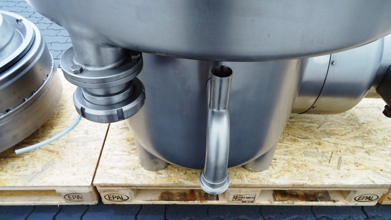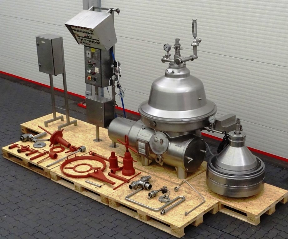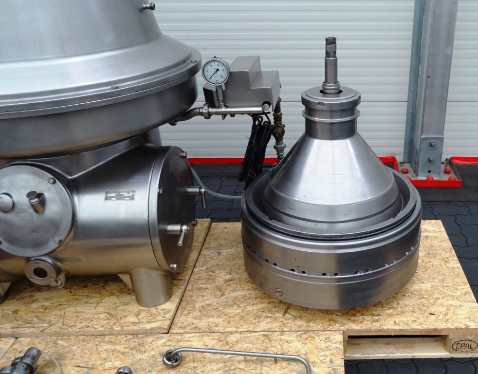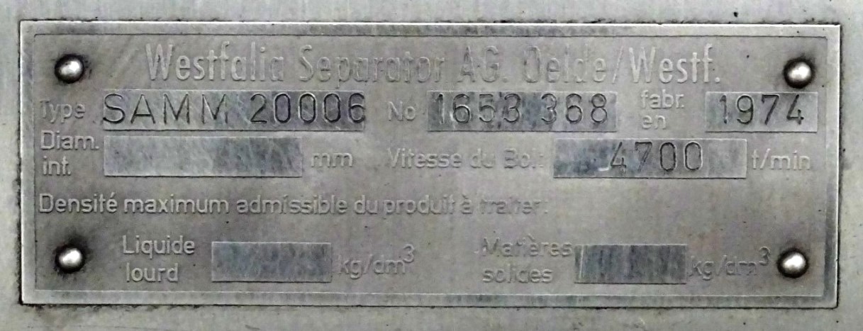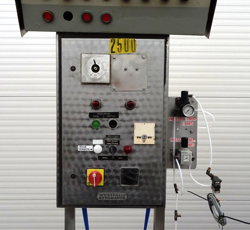 Max bowl speed 4700 RPM, rated @ 22,000 LPH on milk or whey. 30 KW motor 380/3/50/1470 RPM, sludge tank, water valves, base plate, flow meter and inlet/outlet pipes, tools and controls. 1974 vintage. Very good condition. Located in Europe.