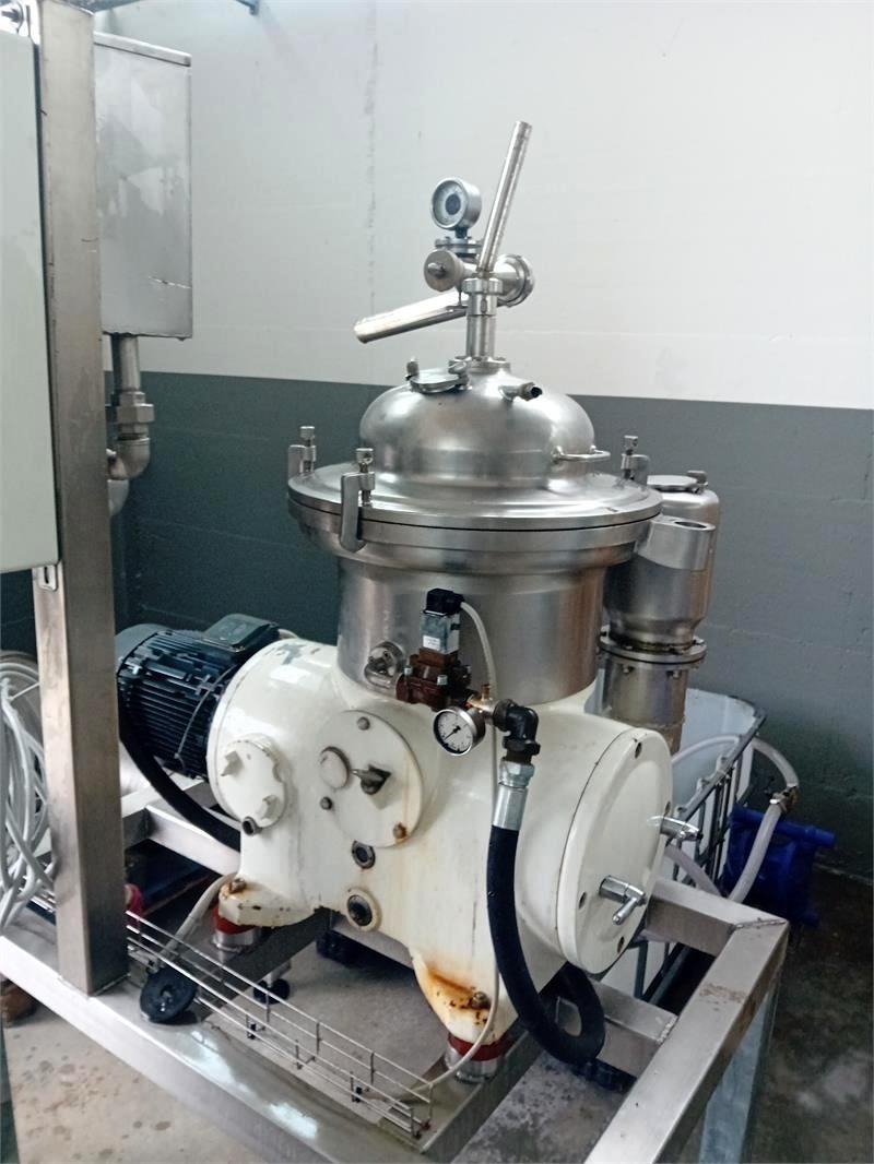 Max bowl speed 7570 RPM, rated @ 4000 LPH. 7.5 KW motor 380/3/50/1450 RPM, sludge tank, flow meter, base frame, water harness, feed pump and control panel, unitized on a SS skid. No tools. Excellent condition. Located in Europe. Equivalent to: SA 14-06-076.