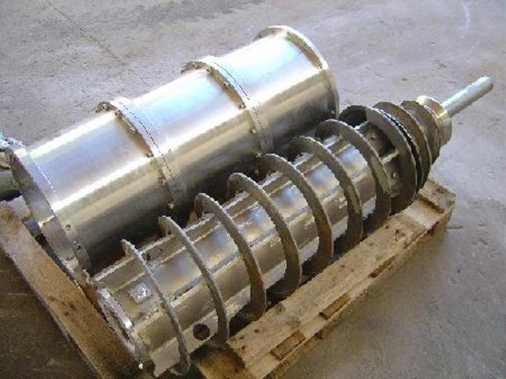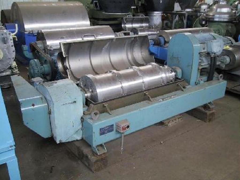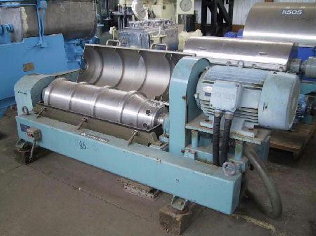 Max bowl speed 4000 RPM, 3100 x G, 14 x 46" (353 x 1160mm) bowl ID, 20 deg beach angle, 70mm single lead STC-tiled conveyor, 159:1 2.5 kNm gearbox, 30 KW motor 380/3/50, 4 KW backdrive, guards, feed tube vibration switch/isolators. Very good condition. Located in Europe.